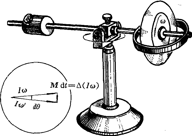 ❷重力回转仪。图2中杠杆一侧装有转子,另一侧滑块可沿杆滑动,当使转子高速旋转时,这个装置就是一个重力回转仪。移动滑块使重心移向转子的一侧,转子旋转方向如图所示,会发现杠杆不会倾倒而是绕铅垂轴作逆时针方向转动。如果将重心移至滑块一侧,杠杆就会绕铅垂轴作顺时针方向转动。回转仪自转轴绕铅垂轴转动的这种运动称为旋动。产生旋动是角动量定理的必然结果。当自转角速度ω很大时,角动量定理可以写成MΔt=Δ(Iω),可知Iω变化方向一定指向力矩M的方向,而ω方向就是自转轴方向,所以自转轴方向始终要保持与M方向一致而产生旋动。当发生旋动时,改变了Iω的方向却没有改变ω的大小,因此Iωdθ=Mdt,dθ是自转轴旋动的角位移,于是旋动角速度Ω=dθ/dt=M/Iω。这是在自转角速度ω很大时计算旋动角速度的近似公式。重力回转仪不屈服于外力矩而产生旋动的奇特现象叫做回转效应。陀螺由于高速回转而不会在重力矩作用下发生倾倒,并且绕铅垂方向发生旋动。行驶很快的自行车,当骑车人身体往右倾斜时,会给自行车轮子提供向前的重力矩,自转轴方向为保持与重力矩方向一致,会使自行车向右拐弯。这些都是由回转效应产生的现象。在技术上,回转效应有许多应用。例如为了提高发射炮弹的命中率,在炮筒内壁有螺旋式的来复线,使炮弹射出后绕自身的几何中心轴线高速旋转,成为一个回转仪,在空气阻力矩的作用下,它只是绕炮弹飞行方向有旋动而不会使炮弹翻转,保证弹头与前进方向基本一致。利用回转效应,还可制成回转罗盘,这是一种供航行和飞行物体作方向基准的指北型回转仪,回转仪的自转轴水平地在子午面内,一端指北。为了补偿由于地球自转引起的子午面的运动,需要设计作用于回转仪的重力矩方向指西,使回转仪向西的旋动角速度与地球自转角速度相等,保证自转轴始终指北。