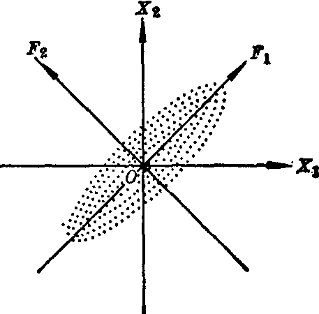 二指标因子分析示意 由图可见,这n个点子的分布有一定规律。这些点子的信息分别由X1、X2来反映,但X1、X2之间又显然有某种程度的相关,即X1增大时,X2也增大。因此若用因子F1、F2来代替X1、X2,也就是用新坐标系F1OF2来代替 旧坐标系X1OX2,则不但可使F1与F2互不相关(F2的大小与F1的大小无关),而且,因为这n个点大多沿着F1轴散开,变异较大,而在F2轴上则变异较小;故F1就反映了X1和X2中所含的主要信息(比如说75%)。这样,只用F1一个因子就能反映原来二个指标所含信息的75%,而F2只反映全部信息中的25%,故称F1为第一主因子,F2为第二主因子。 原理 因子分析有二个基本问题: (1)将指标用因子表达。
