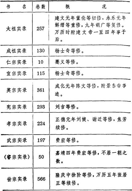 | 释义 | 《明实录》 《明实录》二千九百二十五卷,明代胡广等历朝史官撰修。 明朝建立后,和以前的封建王朝一样,由翰林院的修撰、编修、检讨等官负责撰修国史。明太祖朱元璋于公元1372年(洪武五年)开始建立较完备的官方档案保存制度,规定要把记载皇帝言行的起居注收藏在金匮里,凡是皇帝颁发的诏令、大臣奏事簿籍等都要按照会要体例编成类书,叫“钦录簿”,由各台、省、府建铜柜加以保存。等新皇帝即位后,就任命史官根据这些档案撰修前一个皇帝的实录。 实录修成后,照例誊写两本,正本收藏在宫内,嘉靖年间皇史宬建成后,宫内藏的实录正本即移存于此。 另有实录副本藏于内阁。明代二百多年中,先后修成十五朝实录(建文朝附《太祖实录》,景泰朝附《英宗实录》)记载了十七个皇帝的事迹。其中只有《崇祯实录》十七卷,是清代初期撰修《明史》时补辑的。 《明实录》在撰修过程中和撰修以后,明、清两代史家曾纷纷加以评论,《明实录》的价值,言人人殊。 如指责它取材但凭吏牍,立传但纪迁擢,内容支离琐碎,轻重不当,掩非饰过,过多曲笔,甚至斥为无史。 推崇的呢,则表示对它不敢有一言一事之遗等等。 客观地说,《明实录》所记史事都有宫廷和朝廷各部门的档案作依据,其中虽多曲笔和饰讳之处,但它的史料价值要比一般记载为高,特别是清修《明史》,凡涉及清室祖先的史实,多加隐讳。《明实录》在记载边疆少数民族的活动方面,尚能据史直书,史料价值较《明史》为高。 但是,由于《明实录》是官修史书,就必然带来难以避免的缺陷。从朱元璋起,明朝皇帝都对封建文化采取严厉控制政策,屡兴文字狱,片言只字,往往招来横祸,史官们撰修实录,自然是只说好,不说坏的。 还有一些史官,如焦芳等人,谄事权阉刘瑾,好恶任情,是非颠倒,更使实录记载失实。特别是那些非法夺得帝位的皇帝,为掩饰他的劣迹,在撰修前一朝实录时,也要求有较多的隐讳和曲笔。如《太祖实录》,在永乐年间,曾重修过两次,修改的目的在于预示太祖原打算传位给成祖,而不是建文帝。朱棣为了这个目的,不惜否认自己的生身母亲,而强认马皇后为生母。 《太祖实录》经这样一改再改,结果是越改越失真。更可笑的是所谓《睿宗实录》,这位“睿宗”是明朝根本没存在过的“皇帝”。 他本是宪宗的儿子,被封为兴献王,后来,因为他的儿子朱厚熜(zǒng总),在武宗死后继位是为世宗,兴献王也就被追尊为“献皇帝”,庙号“睿宗”。 公元1525年(嘉靖四年),世宗要替他的父亲撰修实录,任命徐公祚为监修,费宏为总裁,主持其事。徐公祚他们只好请来兴献王府里的臣僚和太监,由他们提供资料。就这样,只花了一年时间,便拼凑成了多达五十卷的《睿宗实录》。 这部没有任何史料价值的“实录”,在当时已没有学者愿意去读,因而也就不能流传到今天。 明朝初年本有禁令,一朝实录修成以后,正副两本便深藏宫中和内阁,非预修实录的人员不得见。 民间更是没有流传。 万历年间,因要改小实录的版式,全部实录重抄一遍,大臣们就趁机私自抄出节录本,于是世间渐有《明实录》流传。但是,经过辗转传抄,讹误脱漏的地方很多。现在传世的《明实录》有几种,其中以北京图书馆所藏的原内阁副本最为完善,可是,仍缺天启四年十二卷及七年六月一卷。 此外,南京图书馆藏的一部《明实录》讹字也多,附有后人补辑的《崇祯实录》二十五卷,原为江苏国学图书馆收藏的传抄本,日伪统治时期,南京梁鸿志于夹壁中获得,因恐流失,决计影印出版。从1939年起开始印刷,第二年二月全部印出,共计二千九百二十五卷,装成五百册,即今流传于世的《明实录》。 在台湾,1961年以后,也以北京图书馆藏本显微胶卷陆续影印出版,并附有原本所缺的《崇祯实录》和《崇祯长编》等及一部分皇帝宝训,是现今所见《明实录》中最全的本子。 《明实录》撰修情况表