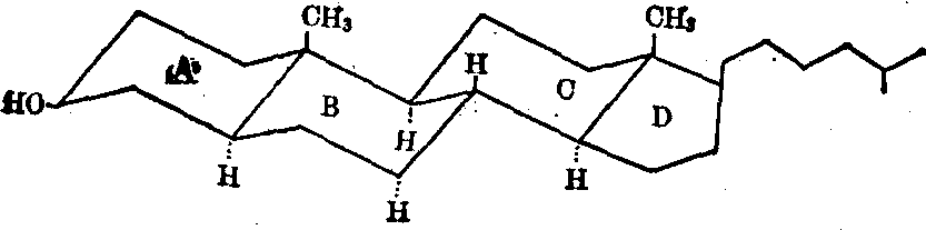 | 释义 | 固醇sterol见“甾醇”。 固醇又称“甾醇”。甾类化合物。以环戊烷多氢菲为基本结构称甾核。在甾核的第3位上有一个羟基,第17位上有一个含8个或更多碳原子的脂肪族侧链。自然界中固醇常与较高级的脂肪酸发生酯化。常见的是胆固醇。 固醇 固醇固醇虽是类固醇中的一类,但体内的类固醇物质均由固醇,尤其是由胆固醇衍生而来。它们都含有一环戊并菲核心结构,常与脂肪并存于生物体中。当皂化后,它们留在“不皂化”的部分,从而可与脂肪分离。 二氢胆固醇结构式 ![]() 二氢胆固醇的立体构象式 从上面二式中可以看出,三个六碳环是以菲分子中的形式排列的,其3位上有一羟基,10及13位上各连一甲基,以及17位上连有一条八个碳原子的侧链;还可看出,碳原子3,5,8,9,10,13,14,17及20等为九个不对称中心,其上连接的原子或基团,如伸向纸平面之上者,应以实线表示,称作β型。而在纸平面之下者,则用虚线表示,称作α型。如此看来,碳原子3上的羟基,8上的氢原子,10及13上的甲基,以及17上的侧链均为β型。若碳原子5上的氢与10上的甲基均在纸平面的同一侧时,A环对B环就是顺型构型,又称正型构型;当二者不在同一侧时,两环之间则为反型构形,又称别型构形。从构象式中可以看出,B环与C环是以椅式反型将A环及D环牢固地并合起来。 体内最重要的固醇、胆固醇,与二氢胆固醇不同之处,只在碳原子5与6之间有一双键而已。真菌(如酵母)中最常见的麦角固醇,不仅在碳原子5与6之间有一双键,在7与8之间还有一双键,这点与7脱氢胆固醇相同;它们在紫外线照射下,分别可转变为维生素D2及D3。麦角固醇的侧链比胆固醇的多一个碳原子,而且在碳原子22与23之间多了一个双键。植物固醇中,以谷固醇及豆固醇为最常见者,其基本结构与胆固醇的相同,只其侧链是由十个碳原子组成,而豆固醇的侧链在碳原子22与23之间也有一个双键。 体内从胆固醇衍生出的多种类固醇的基本结构与胆固醇的大致相同,可参见胆汁酸、皮质激素及性激素等条。 表1 重要的天然固醇