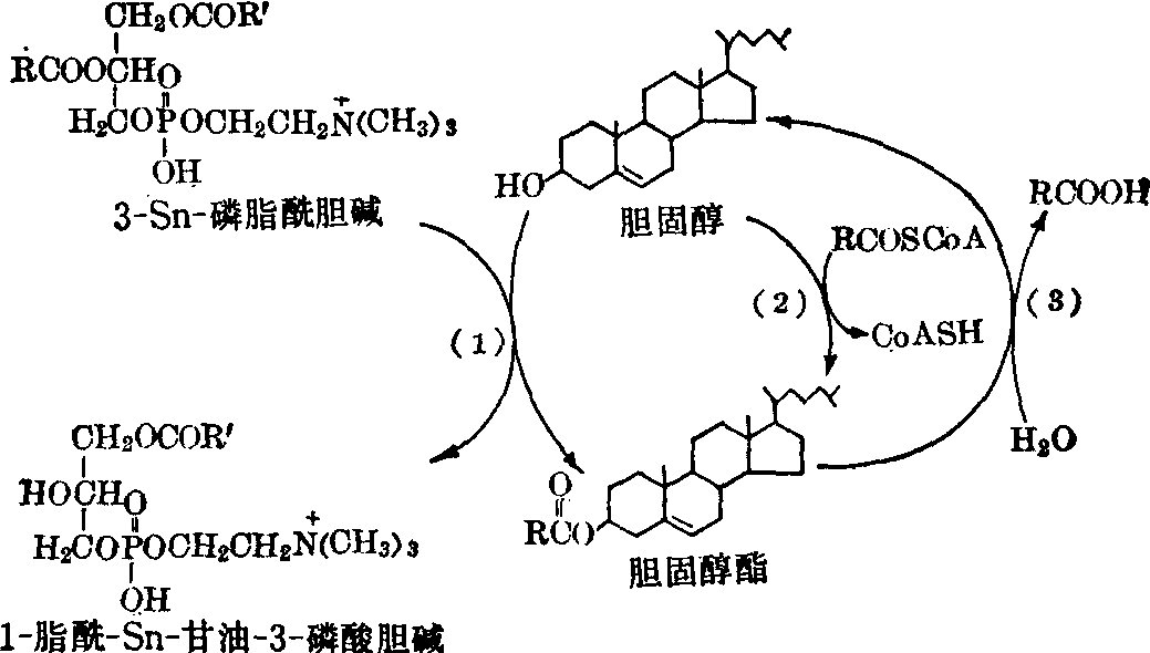图2 HMG-CoA还原酶活性的调节 胆固醇的转化、运输及排泄 胆固醇在组织及血浆中均有游离型及酯型两种存在形式。小肠吸收后进入淋巴的胆固醇80~90%是胆固醇与长链脂肪酸所形成的酯。血浆总胆固醇约2/3为酯型,胆固醇的酯化方式在组织和血浆内有很大不同:在组织中,胆固醇在酰基转移酶的催化下,胆固醇接受脂肪酰辅酶A的脂酰基而形成胆固醇脂。在血浆则主要通过3-Sn-磷脂酰胆碱胆固醇酰基转移酶(因前者旧称卵磷脂,故此酶常用代号LCAT)的作用而酯化。酯化胆固醇的脂酰基来自磷脂酰胆碱的β位,由于磷脂酰胆碱β位结合的多是不饱和脂酰基,因而血浆胆固醇脂所含的脂酰基也几乎全是不饱和的。胆固醇酯的分解则主要通过组织中一种特异的酸性脂酶一一胆固醇酯酶的催化下水解(图3)。 正常时血浆中胆固醇及其酯的比值较为恒定,约为1:2。总胆固醇值发生改变时,血浆LCAT活性也相应发生变化。LCAT在肝细胞内合成,释放入血后,受HDL中载脂蛋白A激活而发挥作用。在患肝病时,除胆固醇合成降低外,LCAT的合成亦发生障碍,血浆胆固醇的酯化作用明显下降,因而胆固醇及其脂之比值升高。胆道梗阻时,胆固醇排泄障碍,两型胆固醇均增高,但其比值基本不变。 胆固醇及其酯都是以脂蛋白的形式运输。各种脂蛋白中含胆固醇量不同,转运的方向也不一样。小肠吸收或合成的胆固醇主要是以乳糜微粒(CM)形式经淋巴入血,肝脏合成的胆固醇则主要以极低密度脂蛋白 (VLDA)形式入血。但是,胆固醇及其酯含量最多、并将它们运送至有关细胞的是VLDL的降解产物——低密度脂蛋白(LDL)。LDL与细胞表面的受体结合后,通过胞饮作用进入细胞,然后在溶酶体的作用下,LDL释放出胆固醇及其脂;胆固醇酯又在脂酶的催化下水解而释放游离胆固醇。细胞摄取胆固醇的调节,是通过控制LDL受体分子合成的反馈机制来实现的。在胆固醇向肝内的转运方面,高密度脂蛋白 (HDL)及LCAT起一定作用。HDL颗粒表面含有丰富的磷脂酰胆碱,在LCAT的作用下,HDL表面的游离胆固醇不断被酯化并向颗粒内层转移,于是使HDL表面与周围组织细胞之间出现一定的胆固醇浓度差,这有利于周围组织的胆固醇向HDL扩散,后者再将这些胆固醇运至肝脏。