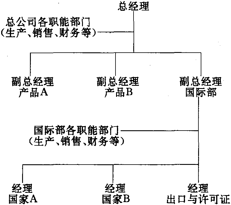 | 释义 | 国际部结构 国际部结构International division在公司中组建国际部,国际部享有与其它部门同等的地位。国际部的建立通常取决于四个因素:首先是企业经营的规模,即企业的国际经营必须达到一定的规模,从而使企业有必要建立一个由一名高级管理人员负责的国际部结构;其次,国际经营的复杂性要求企业建立一个相对独立的部门,以便在对公司的国际市场机会进行总体分析的基础上解决如何进入外国市场的问题;第三,公司必须意识到有必要组织企业内的一些专家来解决国际经营中出现的特殊情况;最后,企业希望增强对国际市场上存在的商务机会和竞争环境进行分析的能力,而不仅仅满足于消极地对公司所面临的局面做出简单的反应。在国际部结构下,国际部通常由企业的副总经理主管,他可以直接向总经理汇报工作。在大多数情况下,国际部的主要职责是为企业制订进行国际业务的政策和全球战略。国际部通常直接负责企业的出口、许可证贸易和国外直接投资业务,并负责协调企业内进行的所有国际业务活动。国际部可以利用各种投资手段为子公司筹措资金,它可以充当各子公司之间交流经验的渠道,还可以利用转移价格来减轻子公司的纳税负担。总之,国际部的任务就是要通过综合发掘公司经营中的各种潜力来提高企业的经营效益。国际部的结构如下: