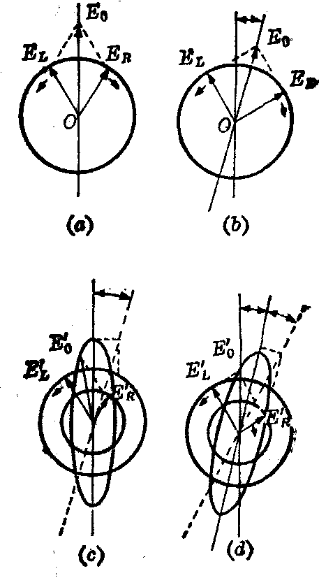 图2 圆偏振光的合成 圆二色性及其定量关系 当左、右圆偏振光进入物质时,光学活性物质分子对左、右圆偏振光的吸收εL和εR不同,其差值△ε=εL-εR也就是圆二色性。如果εL-εR>0,则CD为“+”,相应于正Cotton效应;如果εL-εR<0,则CD为“-”,相应于负Cotton效应(见“旋光色散”条)。由于这种吸收差,造成矢量振幅差,所以从介质出来的光将是椭圆偏振光,常用椭圆度θ或吸收差△ε表示,θ可用圆二色仪测定:
