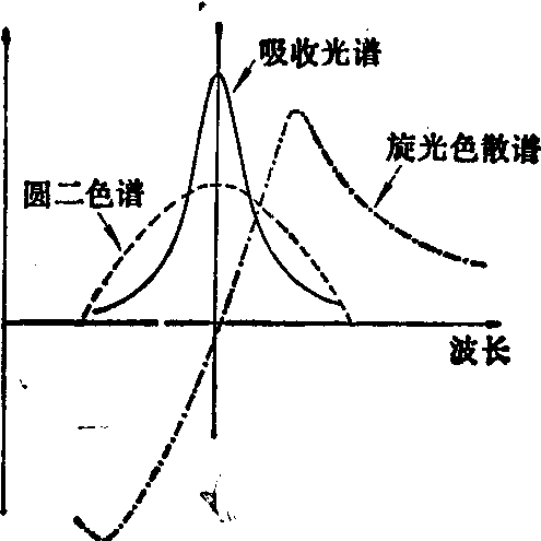 圆二色谱 椭圆度(或比椭圆度等)与波长的关系称为圆二色谱。 圆二色谱和旋光色散谱本质上是相同的。从光学活性物质的吸收光谱、圆二色谱和旋光色散谱可以看到它们的相互关系(图3)。同一个光学活性物质的吸收峰和CD峰的峰位相同,即在此波长的吸收(A)和θ均为最大,而在此波长的旋光度却等于0。