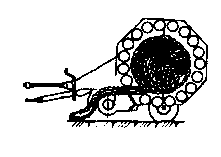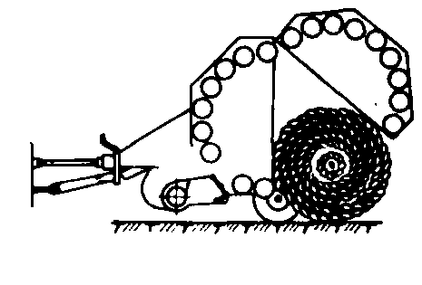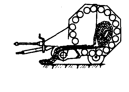 滚子式圆草捆机工作示意图 圆草捆不需要打结,可免去复杂的捆扎机构,用绳量约比小方捆用绳量节省75%左右,草捆自身有一定的防雨渗入的能力而便于室外贮存,贮存时能继续自行干燥,作业成本低。但由于圆草捆重量大,其收获工艺中包括装运输送在内的全过程都必须用机械操作。 利用圆草捆机收获牧草或作饲料用的秸秆时,在捡拾器架处设一喷洒无水氨的装置。可以同时完成饲料的氨化处理。氨用量为秸秆干物质重量的3~3.5%。处理后的麦秸捆经贮存后,可以使喂饲的消化率从28.9%提高到36.7%,粗蛋白质的含量从一般的3.5%提高到6%。 |