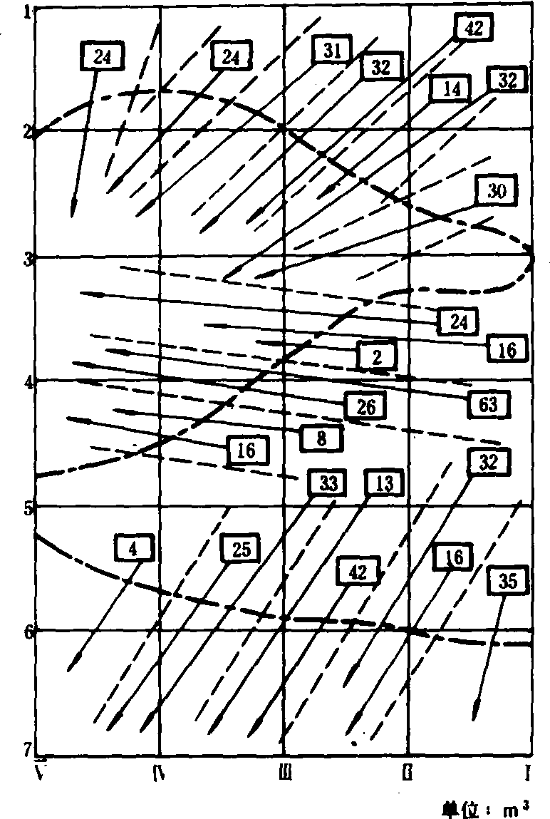 图1 平整单元测量方格图 a.挖填高(m);b.设计高程(m);c.实际高程(m);d.方格内挖填土方量(m3); e.坡降比;点划线:挖填分界线 施工方法 机械化土地平整一般分两步进行,即粗平和细平。若原地表起伏不大,可结合耕耙直接进行细平。 粗平作业时,按施工图中土方调配路线的方向划出宽7~10米的长条小区(图2中的虚线),插上标杆,机械在一个条区或相隔1~2个条区内作业。第一道工序是清表土,其深度为20~30厘米,用铲抛机清表土时沿条区长条方向绕圈,分层把表土抛到相邻条区内;用推土机清表土时,沿条区的垂直方向或斜向依次推到邻区,一次推深15厘米左右。第二道工序是平底土。高差悬殊时用推土机铲推,常用挖槽推土法,当用铲运机(运距超过50米)时,依次将挖方处的土铲运到填方处;当高差不悬殊时,可用平地机平整。底土平整土方量较大,要合理选择行车路线,尽量减少空行程,提高效率。底土平整后的地表高程应比设计高程低20~30厘米(清表土层深度)。第三道工序是松底土。即用松土机或犁将挖方处的底土进行松土或耕翻,其深度为20~30厘米。第四道工序是回表土。即把清到邻区的表土用铲抛机或平地机(斜铲作业)填回均摊。这样,完成一个条区的粗平后,用同样的方法依次完成整个单元的粗平。在平整单元内的小条区多呈平行状态时,可将清、回表土结合成一道工序,即先平好第一个条区后,把下一个条区的表土全部清到已平条区作为回填表土,这样工效更高。若熟土层厚而且地表高差不悬殊,则粗平时不必单独处理表土,可直接平整。细平作业,一般用牵引式平地机进行,先按整个平整单元的对角线方向交叉平整两遍,最后顺长边方向平1~2遍达到平整要求。作业时将平地铲刀刃调整到拖拉机与平地机后轮的支持面内不动,靠其较长的跨度有效地进行平整。无底铲斗式长型平地机细平效果更好(见农用平地机)。每个行程工作幅宽应有15~20厘米的重叠。 旱地改水田或小块水田合并成大块水田的平整,粗平在旱地或水田排水后进行,方法与旱田平整相同;细平在灌水后用水耙或耖田的方法平整。