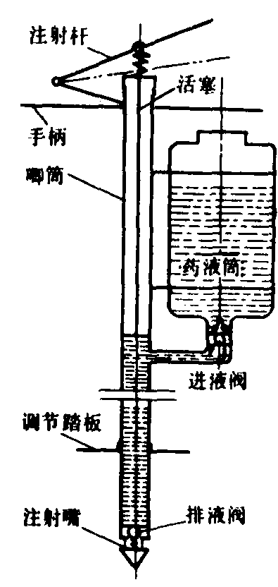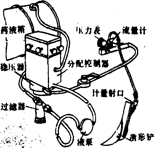 图1 手动土壤注射器 拖拉机悬挂式土壤注射机 结构如图2。按每次施药行数每行设置一个凿形铲,铲的入土深度可以调节。一个小型低压液泵将药液从药液箱经过滤器、稳压器和分配控制器,并经安装在每个凿形铲后面的输液管送到计量射口,射口设置在紧靠凿形铲尖后的地表以上。驾驶员可通过流量计监视施药状况。