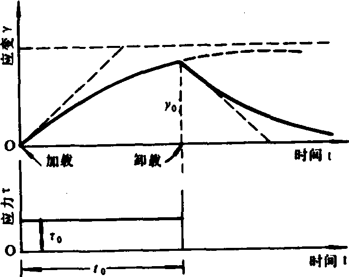 非饱和和饱和土的应力应变和失效状态比较完整地由以孔隙比ν和八面体法向应力(σ8)和八面体剪应力(τ8)为坐标轴的临界状态模型描述,如图2。当土体任一点应力状态到达(R)面时发生流动失效;到达(H)面时发生脆性破坏;到达临界状态线(C)时,土体单元的剪应力不再增加,单元只变形而容积不再变化。 在水田或沼泽土的情况下,往往呈现作用力定常而变形随时间而增大(蠕变)或变形保持定常而应力随时间而消减(松弛)这样的流变特性。当时间效应对所讨论的问题的受力与变形流动具有显著意义时,常将土壤作为含有应力与应变速率或应力、应变与时间之间关系的粘弹塑性体或某种流变体处理。图3为土壤蠕变过程一例。