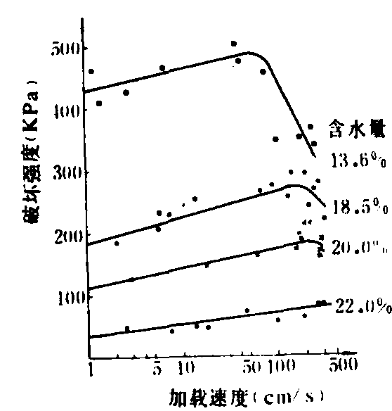 图3 加载与卸载下土体的应变时间关系曲线 土壤在高速下或在振动下的破坏,与静载下有所不同。土壤的高速单轴压缩试验证明,破坏应力随加载速度的增加而增加,与速度的对数成比例,直至一最大值,如图4。突然加载的应力不会立即传到土壤的各个部分,而是随塑性应力波的传递速度Vp扩散。即