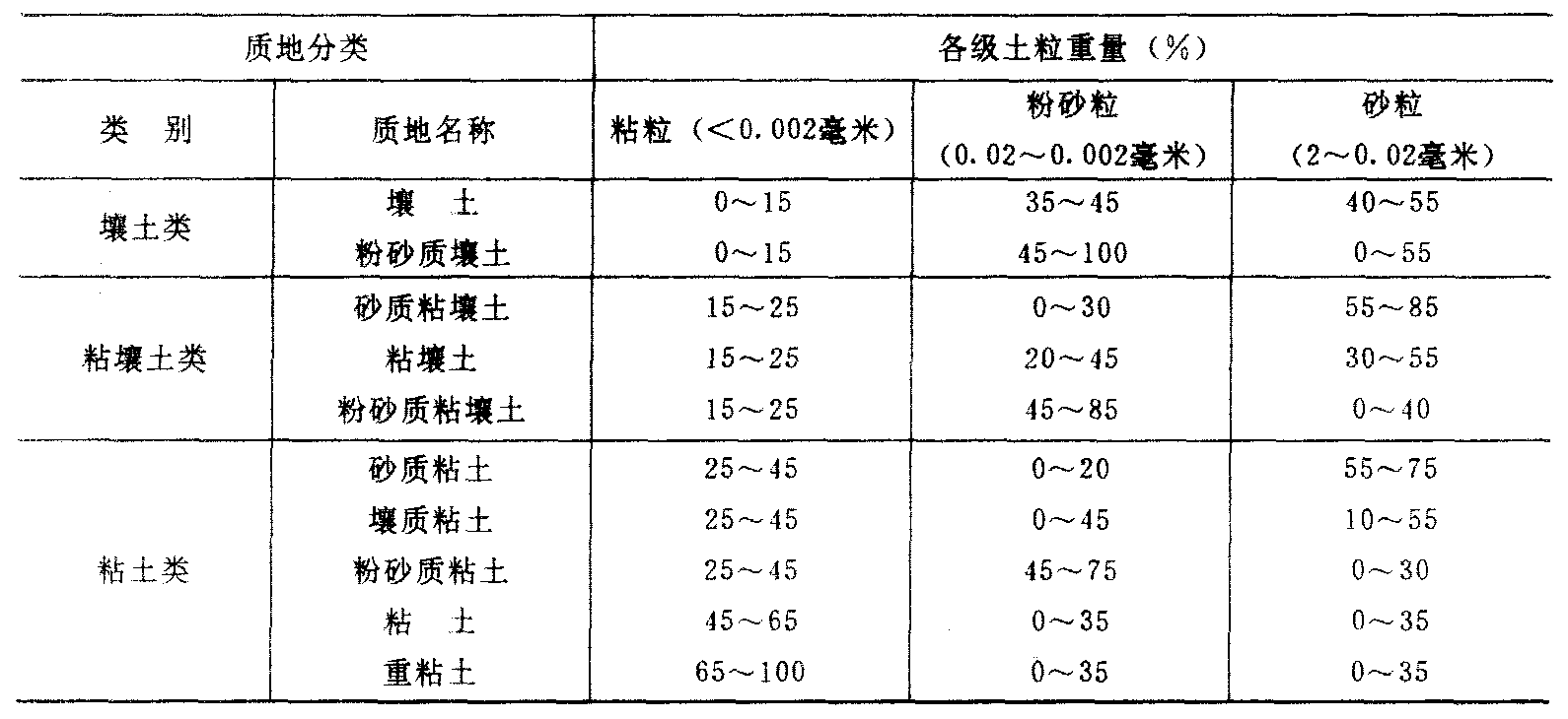 ☚ 土粒粒级 土壤有机质 ☛ 土壤质地 土壤质地Turang zhidi粗细不同的土壤颗粒的比例组合。又称土壤机械组成。是土壤的重要性状。分为砂土、壤土和粘土等类型。土壤质地的特点主要取决于成土母质类型和成土过程的特点,并受人类耕作、施肥等措施的影响。如在石灰岩、红色风化壳和玄武岩上发育的土壤,粘粒较多,质地粘重;在花岗岩及砂页岩上发育的土壤,质地中等;在砂岩、片岩及砂质沉积物上发育的土壤,质地最轻。不同作物对土壤质地的要求不同。各国对土壤颗粒的分级不同,土壤质地分类也各异。 中国土壤质地分类标准(暂拟方案) 国际制土壤质地分类标准