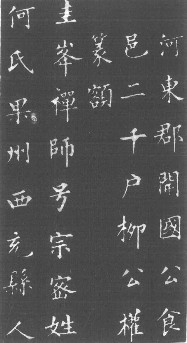 圭峰禪師碑 (局部) 唐·大中九年(855)刻。裴休撰并書。楷書三十六行,行六十五字。額題篆書“唐故圭峰定慧禪師傅法碑”十一字,柳公權書。碑高八尺八,廣四尺二。碑書近似歐陽詢,筆筆謹嚴,結體精密,雖略欠魄力,但絶俗氣,屬晚唐碑之優品。柳公權篆額亦可觀。清武億云: “休 (裴休) 書楷,遒媚有體法。”葉昌熾 《語石》曰: “ 〈圭峰和尚碑〉 尚存,其書遒緊而無蕴藉,學之易滋流弊。細參之,其運筆之操縱,結體之疏密,與誠懸(柳公權)昕合無間。〈大達法師〉 ( 〈玄秘塔碑〉) 係裴撰文而柳書之,此碑則柳題額而裴書之。兩碑微言奥義,非精於梵乘者不能作,其文固宜出於一手。竊訝裴之書,又何以神似柳,既而豁然悟曰:此碑亦裴撰而柳書,特書丹時,并題裴款耳。此言雖創,自謂不為古人所欺。”是碑現存陝西雩縣東南二十公里草堂寺。圭峰禪師乃華嚴宗第五祖宗密,圓寂後葬於此。 |