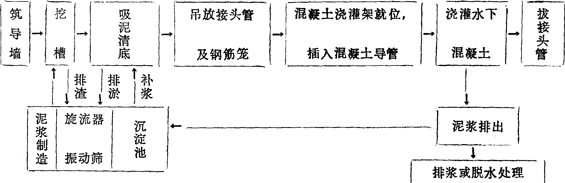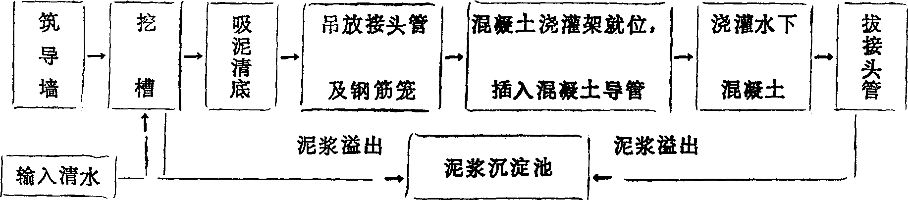 | 释义 | 地下连续墙为截水防渗、挡土、承重而构筑于地下的连续墙壁。它是建造深基础和地下构筑物的一项新技术,它是在地面上用一种挖槽设备,沿着深开挖工程的周边轴线,在泥浆护壁的条件下开挖一条狭长端圆的深槽,在槽内放置钢筋骨架,然后用导管法在泥浆中浇筑混凝土,如此逐段进行施工,在地下构成一道连续的钢筋混凝土墙壁。多用于地下深坑(井)侧墙、高层建筑基础工程及水工结构或临时的维护工程结构中。它具有施工振动小、墙体刚性大、整体性好、速度快、减少土方量,可用于密集建筑群中建造深基坑、可用于各种地质条件下(包括砂性土层、粒径50mm以下的砂砾层)施工等优点。地下连续墙多用多头钻或导板抓斗进行挖土,用多头钻施工的工艺流程如下: