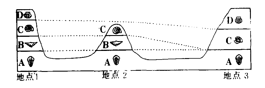 地层对比示意图 ☚ 地史学 古生物化石 ☛ 地层 地层diceng指一定层位的一层或一级岩石。地层可以是固结的岩石,也可以是没有固结的堆积物。它与上下相邻地层之间可以为明显的层面或沉积间断面所分开,也可以由岩生、所含化石、矿物成分、化学成分、物理性质等特征的变化所导致的不十分明显的界限所分开。地层一般指成层岩石和堆积物,包括沉积岩、火山岩和由沉积岩以及火山岩变质而成的变质岩。在不同的地层中常有由不同的生物遗体所形成的化石,如石炭纪、二叠纪地层中则有大量蕨类植物化石,白垩纪地层中才出现大量的被子植物化石等。 ☚ 植物进化历程 沉积岩 ☛ 地层 地层Diceng地壳上部各种成层岩石的总称。主要是沉积岩,但也包括火山成因的和变质岩的成层岩石在内。地层具有特定的地质时代的涵义,因为它是在一定地质时代形成的,每一层每一组都有它自己的形成时代和年龄。而岩层则往往是泛指各种成层的岩石,例如砂岩层、灰岩层,不强调时代的概念。不过,在实际应用时两者也可以互相代替,并不严格区分。如果地层未受到扰动,未发生逆转,它应该是下老上新,这种地层顺序叫正常层位,这种上新下老的关系叫地层层序律。研究地层,划分其新老顺序、等级系列、确定时代,叫地层划分。划分地层必须有一定的根据,一是岩性根据,如砾岩层、砂岩层、灰岩层等;二是生物化石根据,不同时代的地层常含有不同种类的化石或化石石群;三是沉积旋回根据,例如从海侵到海退,沉积岩层(从下而上)应是由粗到细(如从砾岩、砂岩、页岩到灰岩等),又由细到粗(如从灰岩、页岩、砂岩到砾岩等)的有韵律的变化,这种变化称为一个沉积旋回。沉积旋回可以反映海陆变迁及地理环境的变化;四是地层接触关系,如整合、不整合等,它们可以反映在沉积过程中地壳的升降运动或褶皱变动;五是根据地层的同位素年龄,特别是对那些缺少化石的古老地层更为重要。对不同地区的地层进行层位和时代的比较,称为地层对比。通过地层对比可以认识更大范围的区域地层特征。地层对比首先是地质时代或层位的对比,对比的主要根据是生物化石,如图中三个地点的地层中凡含有相同化石的,就用点线连接起来,表示它们的层位(A.B.C.D)或时代是相同的。地点3缺失B层,可能因地壳抬升没有沉积,也可能有沉积而被剥蚀掉了。不含化石的地层一般称为“哑地层”,在这种情况下就不能用古生物方法进行对比,而利用岩性、沉积旋回、岩层接触关系、同位素年龄等进行对比。近年来对微体古生物化石和孢子花粉的研究日益深入,有些所谓哑地层就不“哑”了,可以利用它们作为划分对比地层的重要根据。
