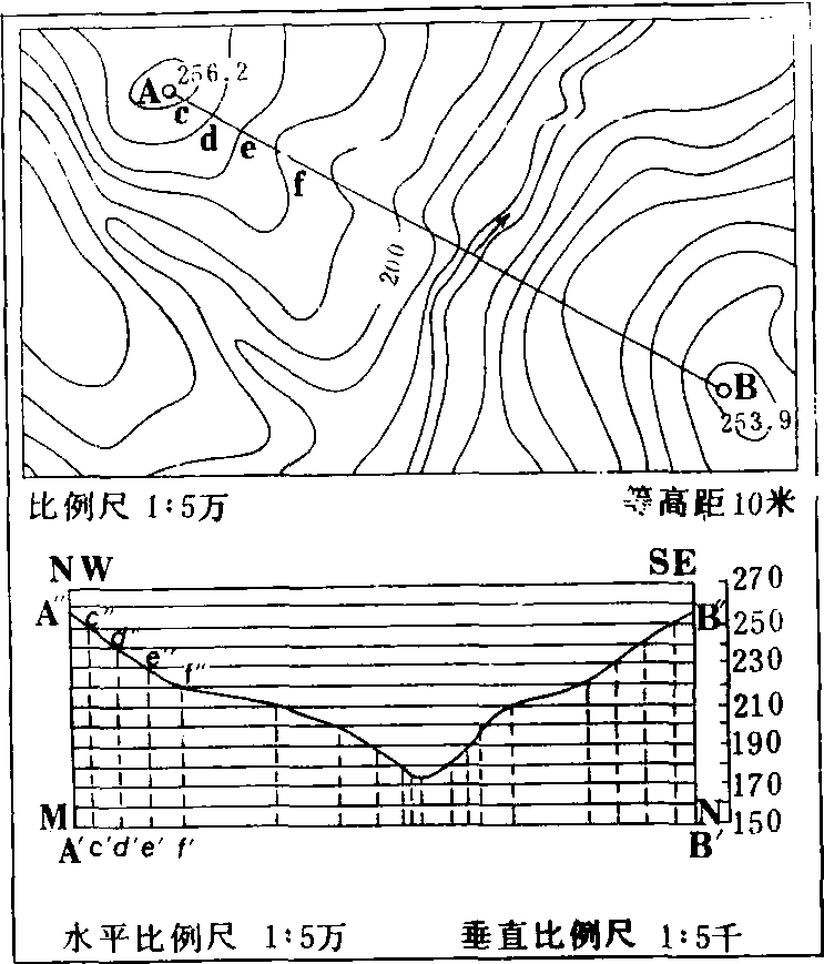 ❷规定剖面图的水平比例尺和垂直比例尺。为了突出地势陡缓情况,通常垂直比例尺比水平比例尺大5—20倍。