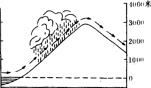 暖湿气流在前进过程中遇山岭阻挡,被迫沿山坡抬升,水汽冷却凝结而形成的降水(如图所示)。其多发生在山地的迎风坡,中国台湾省向风的东坡年雨量均在2 000毫米以上,而背风的西部只有1 200毫米。雨量在迎风坡的分布,先是随着高度的增高而递增,达到了最大降水高度后,随高度的增高而递减。据观测,这个高度因地而异:印度尼西亚爪哇山地约为1 200米,美国加利福尼亚内达山约为1 500米,喜玛拉雅山为1 000—1 500米,阿尔卑斯山约为2 000米。另外,中国西南山地、江南丘陵地带的地形雨也很明显。世界上年降水量最多的地方基本上都和地形雨有关。