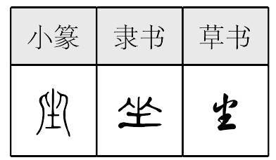 【提示】上面两个人的末笔都是点。 *坐zuò7画 土部 (1) 臀部着地或着物(椅子、凳子等)以支持全身重量:请~|~下来|~卧不安|~吃山空|~失良机。 (2) 乘坐;搭乘:~火车|~飞机|~轮船|~轿车。 (3) 放置(锅、壶等)到炉火上;烧:~壶水喝|把饭~到炉子上热热。 (4) (建筑物、山、田等)背对某方向:房子~北朝南。 (5) 枪炮等由于反作用力而向后移动;物体向下沉:房子向下~了|这枪的~劲不小。 (6) 〈书〉 因为:~此解职|停车~爱枫林晚。 (7) 旧指定罪的因由:~死|~盗|连~|反~。 (8) 落下;长期形成(某种疾病):生孩子~下了腰腿疼的病。 (9) 扣除:每月的房钱都在工资里~下了。 (10) 瓜果等结实:瓜秧上~了个大倭瓜。 (11) 同“座(1)”。座位。 坐 ☚ 在 填 ☛ 坐zuò《说文》所载战国文字从土,上一竖两旁从两人。象二人对坐土上形。后楷书继承,到现代规范字。小篆至隶书多从卯,或稍变形。象一物剖两半状,土上两旁。小篆讹成上一横连着。西汉中期至东汉末象两口或两厶。土即地。唐代以前都席地而坐,坐时两膝着地,臀部压在脚跟上。像商周 (卩)字形。 日本现仍保留些唐代文化习惯。约从宋代以后有椅、凳,臀部坐的位置上移。坐是一种止息方式。现代引申为乘,搭。如:坐车|坐船。又指坐落,在那里。如:坐北朝南。又引申为因。如:坐此解职。又旧指定罪。如:连坐|反坐。又指自然而然。如:孤蓬自振,惊沙坐飞。现代指把锅、壶等放在炉火上。如:坐一壶水。又指物体向后施压力。如:这枪坐力小|房子往后坐了。又同座位的座字。 坐★常◎常