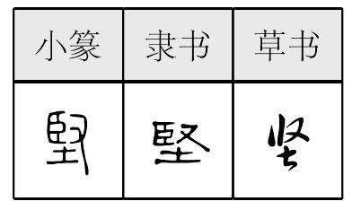 【提示】上左是两竖,不要错写成 。 *坚(堅)jiān7画 土部 (1) 牢固;不易破坏:~冰|~韧|~硬|~如磐石。 (2) 结实、牢固的事物:攻~|中~|披~执锐|无~不摧。 (3) 稳定;不动摇:~决|~强|~持|~守|~信。 坚堅jiān商代甲骨文及金文以后有“臤”字,就是“坚”的本字。从又(手),从臣(古代目字横写,竖写即臣字,商王的臣,是管奴隶的人),臣亦声。商代金文手(又字)在目上。用手拭目,表示专心警戒,是做臣的职务。表示坚定不移,是“坚”的本字。忠心于王的行为是好的,所以又是“贤”的本字。古音“臣”与“坚”音近。“臤”是坚硬义,小篆以后增“土”旁,作“堅”。西汉章草以后“臣”在左上角时作两竖,前笔比后笔稍短。“”现在规范为简化偏旁,可类推。“坚”是结实,硬,不容易破坏的意思。如:坚不可破|坚守。组词如:坚固|坚强|坚决|坚持|中坚。 坚堅★繁◎常★常