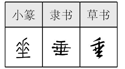 甲骨文为象形字,像草木花叶下垂。许慎认为是“陲”之本字,从土。《说文》:“垂,远边也。”古代在边境上垒土为界,谓之“边陲”。作声符生成的字有: