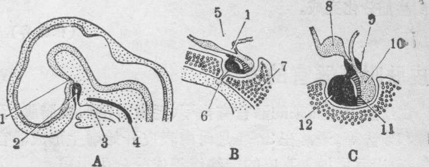 | 释义 | 垂体的发生 垂体的发生垂体为位于脑底部下丘脑下方能分泌多种激素的重要内分泌腺。其原基由二个部分所组成(见图): 一个来源于原始口腔顶部口咽膜前方的外胚层向间脑底壁外突所成的Rathke囊,以后形成垂体前叶、结节部和中间部,即腺垂体。另一个是间脑底壁局部向腹侧外突而成的垂体漏斗囊,故来源于神经外胚层,后来演变为垂体的神经部、漏斗柄和正中隆突,即构成神经垂体。此二部分囊样突起在人胚第3周末出现。到第6周时,两个部分已彼此相遇合形成垂体原基(图中A)。第7~8周时,Rathke囊的柄部萎缩,与原始口腔的通道封闭而失去连接,偶尔,部分留存成为咽顶壁内的咽垂体。第10~11周时,垂体漏斗囊增大成为神经部(叶),其基部变长,形成漏斗柄和漏斗灰结节的正中隆突区(图中B)。与之相贴的Rath-ke囊形成为双层的杯状结构,其内壁软薄发育较差,成为腺垂体的中间部,它与神经部构成了垂体后叶。Rathke囊杯状结构的外壁(前壁)较厚,细胞增殖活跃形成为膨大的垂体前叶,其顶部形成结节部,其囊腔最后在前叶与中间部之间成为残留的缝隙状腔隙(图中C)。至胚胎3~4月时,垂体前叶开始出现三种腺细胞,嗜酸细胞(α细胞)的分化略早于嗜碱细胞(β细胞)。但胚胎时期,大多数为嫌色细胞(γ细胞),其总数较成体时为多。