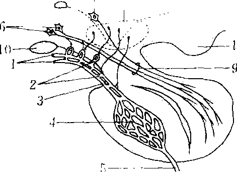 垂体门脉循环 1. 垂体上动脉 2. 初级毛细血管网和袢 3. 垂体门静脉 4. 次级毛细血管网(血窦) 5. 输出静脉 6. 视上核 7. 室旁核 8. 下丘脑促垂体区 9. 下丘脑垂体束 10. 视交叉 11.乳头体 |