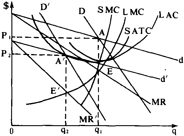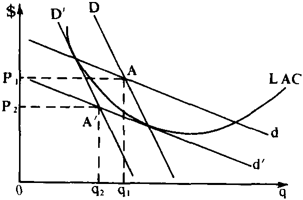 垄断竞争厂商的长期均衡Long-Run Equilibrium of Monopolistic Competitive Firm在长时期内,垄断竞争厂商为了实现最大利润,将会调整自身的生产规模。为了分析该长期均衡的实现过程,假定行业中的该代表性厂商达到短期均衡时具有正的经济利润。如图1,由于d和D的交点A意味着厂商实现了短期均衡且具有正的经济利润,所以新的厂商将被吸引过来,并将夺去该代表性厂商的一部分市场,从而使其需求曲线D下移至D′,厂商期望的需求曲线d也将下降至d′,从而使厂商的MR曲线下降,直至MR′,并与LMC恰好相交于E′,从而使d′和D′相交于A′为止,得到新的产量q2和新的价格P2。由于这时的经济利润为零,所以该垄断竞争厂商的长期均衡得以实现。当长期均衡实现时,LAC曲线与d′相切,而不与D′相切。如图2,如果随着新厂商加入,D曲线下移至与LAC相切的D′,d曲线随之下降至d′的话那么D′与d′相交的A′点所对应的产量q2和价格P2就会使厂商蒙受经济损失,即经济利润为负,因为A′点位于LAC曲线以下。 所以,垄断竞争厂商的长期均衡必须满足以下两个条件:(1)MR=LMC;(2)D曲线与d曲线相交,且LAC在这一交点与d曲线相切。