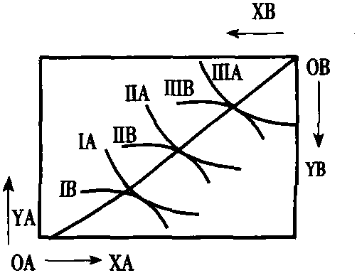 | 释义 | 埃奇沃斯方框图Edgeworth box一种用于分析均衡条件和资源配置的几何图形,由英国经济学家埃奇沃斯,弗朗西斯·伊西德罗(Edgeworth,Francis Ysidro,1845~1926) 首创并因此得名。假定既定数量分别为X和Y的两种产品X和Y在两个消费者A和B之间分配。参见下图,盒子的水平长度和垂直高度分别表示两种商品的全部数量X和Y,OA,OB分别为消费者A,B的原点。OA水平向右测量消费者A对X的消费量XA,垂直向上测量其对Y的消费量YA; OB水平向左测量消费者B对X的消费量XB,垂直向下测量其对Y的消费量YB,每个消费者都有一组无差异曲线,代表能为他带来相同效应的各种商品组合(图中画出了部分无差异曲线,分别以ⅠA,ⅡA,ⅢA和Ⅰ B,ⅡB,ⅢB表示),盒状图表示将两种商品全部分配给两个消费者的所有可能的配置方式。在消费者A和消费者B的无差异曲线相切的那些点上,达到了帕累托最优状态,实现了交换的均衡。即任何改变都不能使至少一个人的状况变好而没有人状况变坏。这些点的轨迹也称为契约曲线。契约曲线上的每一点对于消费者A和B来说,两种商品的边际替代率相等。此图不仅可用于分析交换过程,也同样可以用于对生产过程中的均衡条件和资源配置的分析。此时X和Y代表生产两种产品A和B的两个生产者所拥有的两种生产要素。盒子的水平长度和垂直高度分别表示两种要素的全部数量X和Y。图形表示生产者将这些数量的资源全部用于生产产品A和B的各种可能的方式。产品A的等产量曲线(ⅠA,ⅡA,ⅢA)和产品B的等量曲线(ⅠB,ⅡB,ⅢB) 的切点,代表了资源的有效配置点或生产的均衡点,在生产的契约曲线上,对于两个生产者来说,两种要素的边际替代率相等。此图作为一种分析工具在经济研究中得到了广泛的应用,它不是孤立地研究某种产品或某一市场的均衡问题,而是以直观的方式,通过简单的两商品交换或生产的经济分析了经济的一般均衡问题。