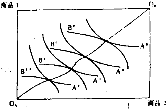 图中,A和B两个消费者分别位于盒型图的左下角和右上角,他们各自在商品1与商品2之间进行买卖交换和选择。AⅠ、AⅡ、AⅢ、AⅣ等等代表两种商品对于A消费者的无差异曲线群,BⅠ、BⅡ、BⅢ、BⅣ代表两种商品对于B消费者的无差异曲线群。将A与B的各对无差异曲线的相切点联接起来,便会形成一条联接左下角与右上角的曲线,它叫作契约曲线(contract curve)。由于无差异曲线的斜率含义为两种商品的边际替代率,故而在契约曲线上的各点将满足两种商品的边际替代率对于两个消费者均相等的条件。这意味着,只要两个消费者沿着契约曲线进行两种商品的买卖或交换,便能够取得最大效用,从而实现经济福利最大化,亦即所谓帕累托最优状态。如果实际的交换不是位于契约曲线上,那么通过将交换推进到契约曲线就会改进福利状况。 上面说的是交换最优的情况。实际上运用盒式图还可以说明生产最优的情况,只要把A与B换成两个生产者,商品1与商品2换成两种生产要素投入,AⅠ、AⅡ、AⅢ、AⅠ和BⅠ、BⅡ、BⅢ、BⅣ代表两个生产者的等产量曲线,那么便可以表明,生产的最优化,亦即两个厂商对于生产同种产品的两种生产要素的最优数量组合,将同样位于契约曲线上。如果将A与B换成所要生产的两种产品,那么运用上图还可以表明同一厂商在两种不同产品的生产上对于不同生产要素的最优数量组合。 ☚ 帕累托最优化 补偿原则 ☛ |