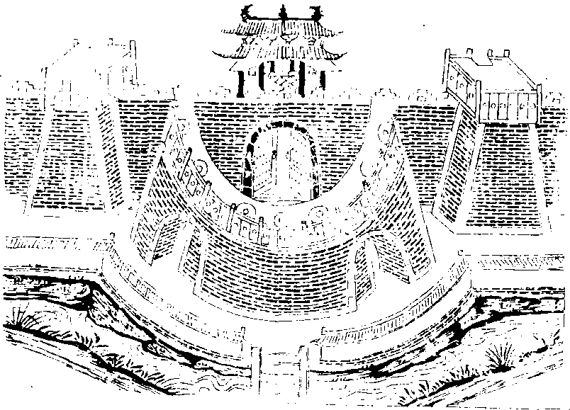 古代名物 > 宫室類(上) > 城邑部 > 城垣 > 城2 城2 chéng 城牆。古代都邑四周用以防守的圍牆。内稱城,外稱郭。古制:天子之城千雉,高七雉;公侯百雉,高五雉;子男五十雉,高三雉。隋唐以前,多用版築法築造土城。唐以後或將土城甃之以磚,或用磚砌。北方居平原建城,多方正;南方依山傍水築城,則多長條形。《詩·大雅·文王有聲》:“築城伊淢,作豐伊匹。”《公羊傳·定公十二年》:“五版而堵,五堵而雉,百雉而城。”唐·白居易《想東遊五十韻》:“郊静銷戎馬,城高逼斗牛。”《三國演義》第七十四回:“公遂上馬,引數騎上高阜處望之,見樊城城上旗號不整,軍士慌亂。”清·崔述《春日》詩:“砌幽生草碧,城古帶煙斜。”