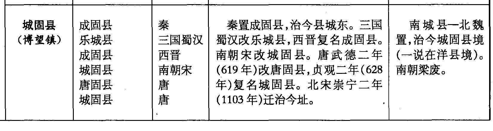 城固县(博望镇)成固县乐城县成固县城固县唐固县城固县秦三国蜀汉西晋南朝宋唐唐秦置成固县,治今县城东。三国蜀汉改乐城县,西晋复名成固县。南朝宋改城固县。唐武德二年(619年)改唐固县,贞观二年(628年)复名城固县。北宋崇宁二年(1103年)迁治今址。南城县—北魏置,治今城固县境(一说在洋县境)。南朝梁废。