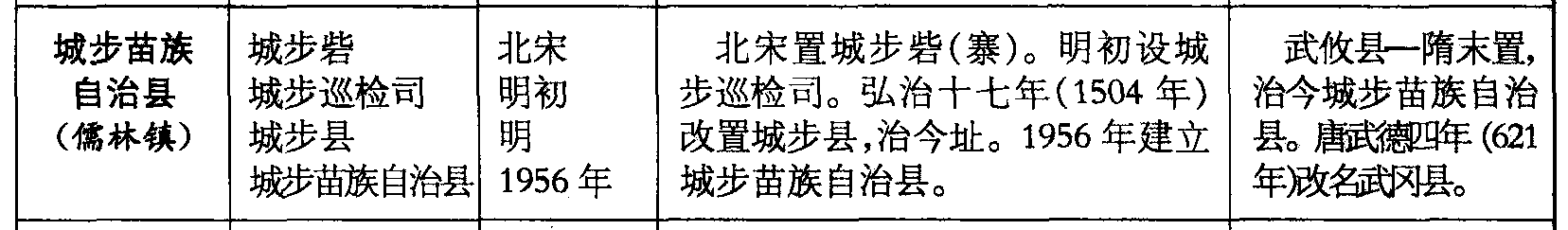 城步苗族自治县(儒林镇)城步砦城步巡检司城步县城步苗族自治县北宋明初明1956年北宋置城步砦(寨)。明初设城步巡检司。弘治十七年(1504年)改置城步县,治今址。1956年建立城步苗族自治县。武攸县—隋末置,治今城步苗族自治县。唐武德四年(621年)改名武冈县。