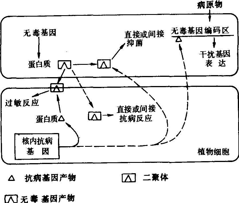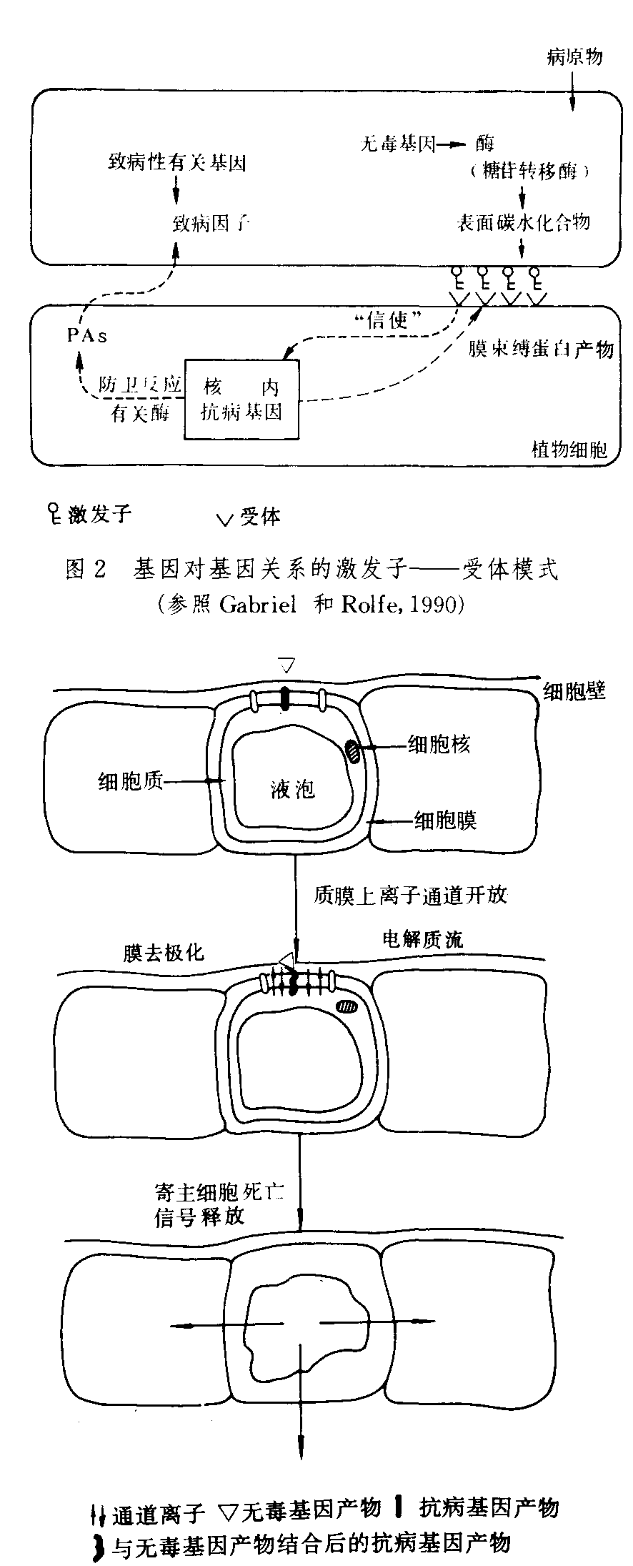 图1 基因对基因关系的二聚体模式 (引自Gabriel和Rolfe,1990) 感病反应 病原物基因产物与寄主基因产物特异性互作导致感病反应。主要适合于病菌产生寄主专化性毒素的病害。病菌基因的产物是毒素,寄主基因的产物是毒素受体,只有感病寄主的基因产物才能与毒素互作,而抗病寄主没有决定表现型的基因产物(表3)。