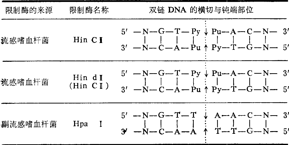 酶系的选用 基因工程涉及整个核酸酶系,主要有限制性核酸内切酶、末端转移酶和核酸连接酶。 (1) 限制性核酸内切酶: 简称限制酶,广泛地分布在很多微生物内,是各种细菌破坏异源DNA、保护自己DNA完整的武器。限制酶能把DNA大分子切断成若干小片,常用于分离目的基因和切开环状载体,为制备新的DNA组合创造条件。限制酶的特点首先是能识别DNA中的特殊顺序,该顺序由4~6个特定核苷酸组成,在双链DNA上排列成回纹式顺序; 其次是能在识别部位的旋转对称轴上或附近某点上把两个邻近核苷酸之间的连接切断,即通过水解把一个核苷酸脱氧戊糖中3′位碳同另一个核苷酸脱氧戊糖中5′位碳之间的磷酸二酯键切断,形成含5′-P和3′-OH的片段。按切断方式可分两类: 一种是交叉切断,即在两链上特定部位(即识别部位)的左侧(按由5′→3′的方向)切断各个单链,由此产生的识别部分各形成一个方向相反的互补碱基末端,这种末端叫做粘性末端,因为在一定条件下,两个粘性末端又可以互补粘合,恢复原形(表1)。另一种是在DNA分子的旋转对称轴上横切,在切口两侧形成两个钝端或称平端(表2)。 表1 限制酶的识别部位与切点
