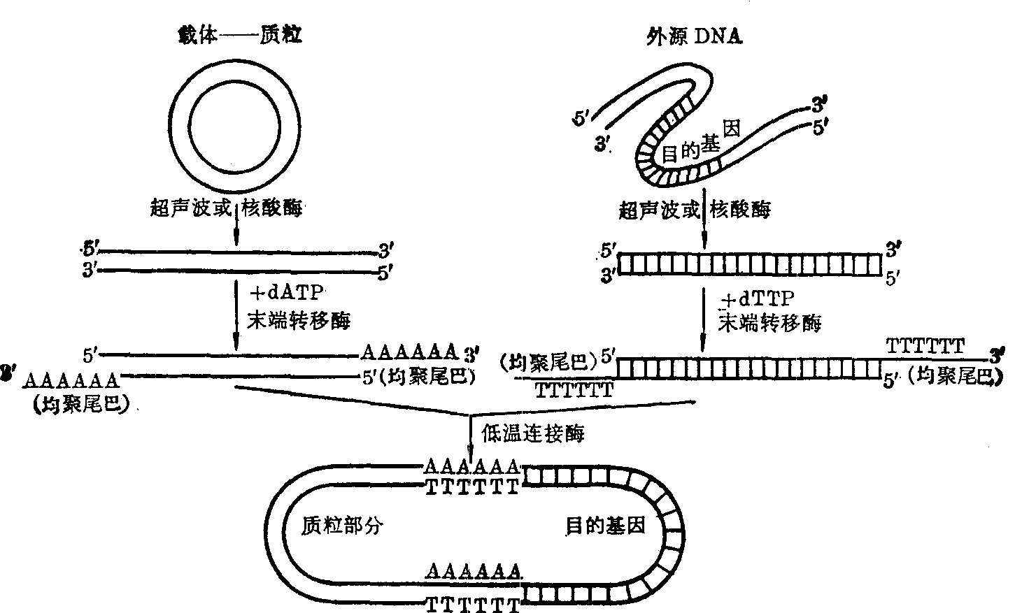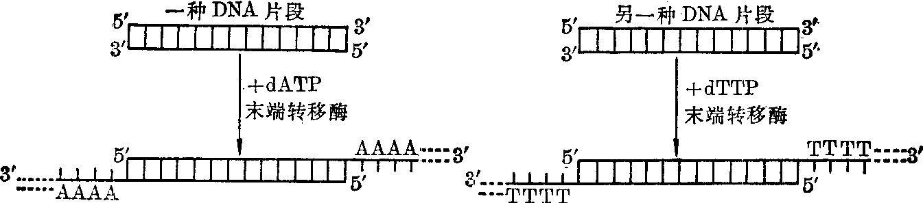 A、T、G、C表示DNA分子中的碱基,箭头表示切断点,虚线表示对称轴,N表示任一种碱基,Pu表示嘌呤碱,Py表示嘧啶碱。 (2) 末端脱氧核苷酸转移酶: 简称末端转移酶,是从幼牛胸腺提取纯化的,它不需要模板,可以把任何一种或多种脱氧核苷酸连接在一个DNA片段的3′-OH端上,如只用一种这样连接的多聚物叫做同聚或均聚尾巴(图1)。同聚物的性质随所用底物而异,例如一种DNA片段的3′端可用脱氧腺苷三磷酸(dATP)为底物而形成A-A-A-A……,另一种DNA片段的3′端则可用互补脱氧胸苷三磷酸(dTTP)为底物而形成T-T-T-T……,从而造成两种DNA的人工粘性末′端。同样,也可分别连接G-G-G-G……和C-C-C-C…… 同聚尾的互补粘性末端。此法的优点是: ❶任一种DNA片段的两端都连上一个同聚尾,可以避免本身粘合成环; ❷同聚尾比限制酶切所得粘性末端长,使2个DNA片段之间,易于配对,粘合比较紧密,所以不需要在体外连接,就可以直接用于转化,然后利用受体细胞内的连接酶进行连接。缺点是回收目的基因比较困难。 (3) DNA连接酶: 从细菌和T4-