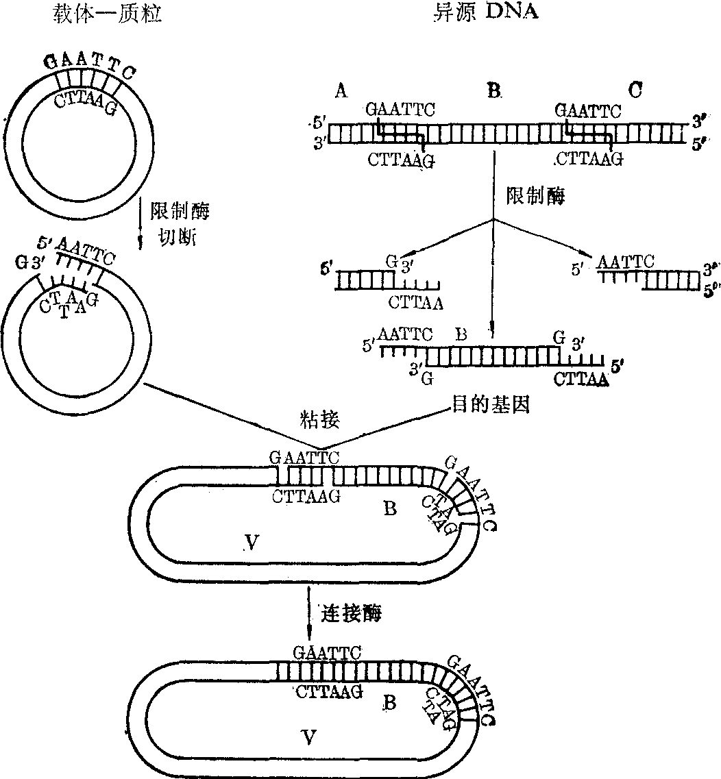 (4) 反向转录酶:见本条中“目的基 图1 末端转移酶作用与同聚尾形成 重组体的构建 DNA体外重组是将目的基因用DNA连接酶接在合适的载体DNA上,以便下一步转化之用。这样重新组合的DNA叫做重组DNA,简称重组体,因为是由两种不同来源的DNA组合而成,所以又称为异源嵌合DNA。连接方式主要有粘接法和平端连接法,后者包括平接法、接头法和均聚尾巴连接法。 (1) 粘接法: 用适当的限制酶分别降解含有目的基因的DNA及切开载体DNA,使它们的二端各具有相同的粘性末端,然后在适当温度下,两者的互补粘性末端通过氢键配对,再用DNA连接酶(共价)连接(图2)。此法优点是在克隆繁殖后经过同一限制酶降解,可以回收目的基因。缺点是载体自身两端也有互补粘性单链,粘合成环的机会很大,需在高浓度的外源DNA条件下或用单酯酶将载体上的5′P切去,使之不能自接,才能避免粘合。 (2) 平端连接法: 有些限制酶不产生粘性末端,机械剪切也产生平端,平端连接法大体有以下几种: ❶平接法: 载体和目的基因的平端,可用大量T4噬菌体DNA连接酶连接起来。 ❷接头法: 利用核酸化学合成技术,可以合成含有一种或多种常用限制酶识别顺序的双链DNA短片段,这类DNA短片段叫做接头。然后用DNA连接酶把接头连接到目的DNA的两端,再用该种限制酶将接头切成具有粘性末端的单链,便能同经过同一种限制酶作用的载体的粘性末端互补进行粘接。这种接头法适用于没有所需限制酶切点的目的基因,或者为避免破坏目的基因上没有切点的限制酶接头。这个方法的优点也是可以用同一限制酶回收目的基因。(图3)