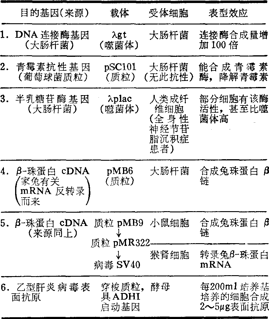 图4 均聚尾巴连接法(dA-dT连接法) 洗干净,最后进行放射自显影。凡是具有放射性的菌落就含有目的基因。还有一些检测方法是通过目的基因的表达产物来鉴定和筛选。例如免疫化学法: 蛋白质是基因表达的产物,利用某种蛋白质的荧光抗体或放射性标记过的抗体来鉴定和筛选菌落,其中含有为该种蛋白质编码的特定基因。又如互补法: 一个缺失某种基因的菌株,在不含该基因产物 (蛋白质或酶) 的培养基中就不能存活,但如果经过有关基因的转化和表达后,即使培养基中没有这个基因的产物,这个营养缺陷型菌株也将能正常存活。因此可运用这个互补原理来筛选有关基因的转化体。(2) 重组体鉴定: ❶琼脂糖凝胶电泳: 重组体通过扩增,其含量可达总DNA的50%,不用提纯便可在凝胶电泳中,看到重组体区带,而且只需要单菌落就能快速灵敏地检测出来。 ❷DNA顺序分析: 用适当方法(例如Sanger及洪国藩等建立的非随机法或Maxam和Gilb-ert采用的特异性化学降解法或吴瑞和郭礼和的外切酶Ⅲ法) 将重组DNA的核苷酸顺序分析出来。这是最可靠但比较费时费事。 ❸杂交抑制转译法:其原理是,在无细胞转译系统里,mRNA能指导蛋白质翻译;在同DNA杂交互补结合以后,mRNA便失去转译作用,然而当mRNA从杂交体上解离出来,就又能指导转译。 ❹R-环图谱: mRNA和基因库中重组DNA的一条有义链互补,在高浓度甲酰胺(70%)中形成稳定的杂交双链,在电镜下,这个杂交双链和DNA的另一单链呈环状,叫做R环。真核生物基因的不连续性就是这样检测出来的。 ❺Southern吸印术: 由Southern建立,其原理是,将琼脂糖凝胶上的DNA电泳区带吸印至硝酸纤维纸上,然后用放射性同位素标记过的DNA或RNA作为探针来杂交。放射自显影将显示目的基因的存在。 目的基因的表达 重组DNA转移至受体细胞后,其目的基因能否发挥其特异性表型效应,只能根据其作用和表达来判断。有关这方面的研究正逐步深入,已获初步成果(表3)。 表3 原核细胞与真核细胞间异源基因的表达