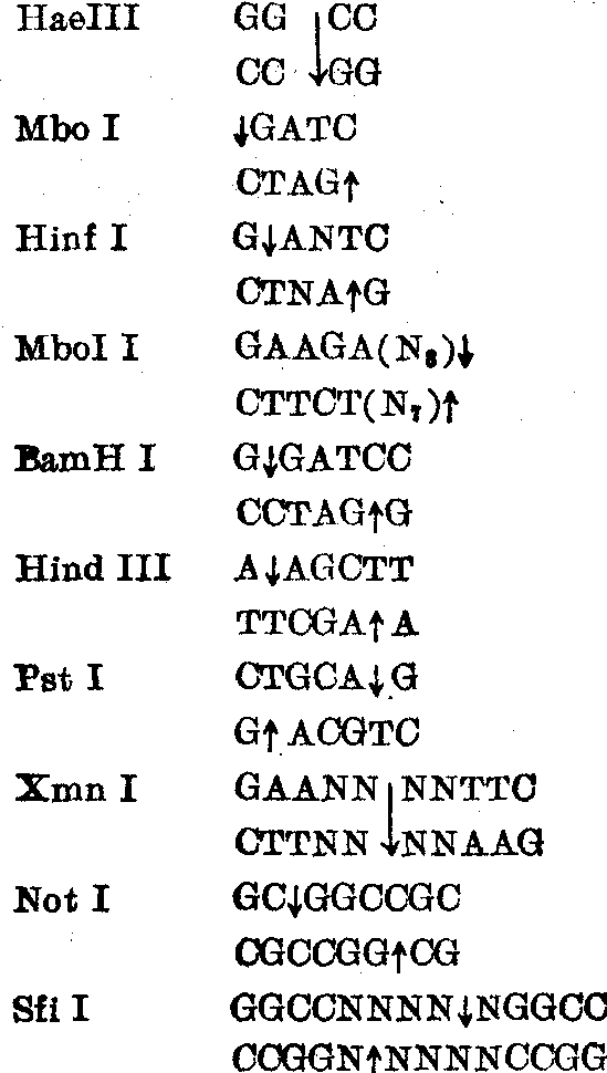 自1971年始,美国约翰·霍普金斯大学的另一位教授D.Nathans及其同事应用HindⅡ研究了SV40 DNA的酶切降解作用,排出Hind Ⅱ的酶切图谱,并成功地确定了SV40DNA的复制起点,成为第一个应用限制性核酸内切酶研究基因结构和调控的科学家。从此限制酶成了基因工程中剪切基因的主要工具。 据美国冷泉港生物实验室的Roberts教授统计,到目前为止已从500多种细菌及微生物中发现限制性核酸内切酶,有的可以同时存在四种不同特异性的限制性核酸内切酶。若按酶的识别特异性来分,共有100多种。 1. 命名: 为了统一起见,Nathans和Smith提出了命名限制性核酸内切酶的规则,即限制性核酸内切酶的名字从相应微生物的拉丁文名中摘取,由其属名的第一字母(大写)和种名的第一、二两字母(小写)组成,若有第四个字母则来自株系,最后的大写罗马数字表示同一细菌中存在的几种不同特异性的酶,例如HindⅡ就来自:
