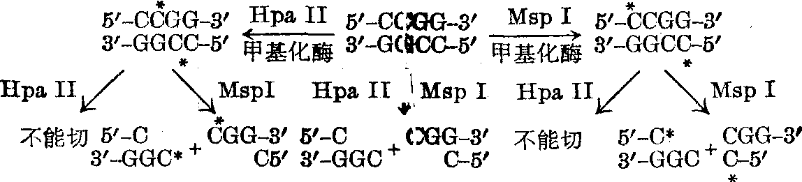 微生物限制修饰体系中对DNA起修饰作用的是甲基化酶。甲基化酶能把S-腺苷甲硫氨酸中甲基转移到核苷酸的腺嘌呤或胞嘧啶环上,分别形成N6-甲基腺嘌呤或5-甲基胞嘧啶。这类甲基化酶的特点是酶具有识别特异性。一般说一种特异的限制性核酸内切酶均有其相应的,即具有相同识别特异性的甲基化酶存在,它们使限制酶识别的核苷酸序列中的A或C甲基化,从而抗阻了限制性核酸内切酶的降解作用。例如: