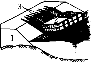 埽工 1.堤 2.压埽土 3.顶桩 |