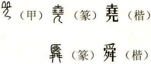 堯,殷墟卜辭用作人名,如“堯入”、“堯妣”等。揆情“堯”是堯帝的專用諡字。 堯,帝嚳子,《史記·五帝紀》是這樣記載的:“帝堯者,放勛。其仁如天,其知如神。就之如日,望之如雲。富而不驕,貴而不舒。黃收純衣,彤車乘白馬。能明馴德,以親九族。九族既睦,便章百性。百姓昭明,合和萬國。”“堯立七十年得舜,二十年而老,令舜攝行天子之政,薦於天。堯辟位凡二十八年崩。百姓悲哀,如喪父母。三年,四方莫舉樂,以思堯。”堯真正是以德治國的天子。 甲骨文的“堯”( ),從一跽坐之人上二“土”形,為會意字。“ ”是堯帝的專用造字,有以下理由:(1)“ ”(土)在甲骨文時是祖先的代行符號,這裏的“堯”是尊崇祖先的表意。從黃帝時代到西周,炎黃兩個族落長期通婚,子裔蕃衍,人丁星繁。堯,黃帝第四世孫,這裏的“堯”是祭祀炎黃二祖。(2)土在五行為中央,“ ”意味著二祖對中原祭祀的繼承和占據。(3)土也可理解為地域,“土”的比肩為對土的兼併占有。 (4)增土為臺,臺為高土,“ ”也表意為受祭者的高大、高位。小篆的堯( )從兀,從垚,垚也聲,為意音字。“垚”(丨ㄠ)垚為三土,增土為臺,臺為高土。“兀”(ㄨ)是人上一橫(天),代表空間的至高,故兀有高聳凸出意。小篆的“堯”是一個悉心塑造的字。堯的本意是帝堯放勛,號唐堯,“唐”又有大意,故唐堯就具有至高至大的意蘊,下列幾個雙音詞也可相佐: 堯山:據傳唐堯始封之地,在今河北邢台縣東北。 堯天:堯能效法天道以推行教化,《論語·泰伯》:“唯天為大,唯堯則之。” 堯年:堯時天下太平,因以比擬盛世。 堯典:《尚書》第一篇,記載堯傳位於舜及堯舜創建盛世的事跡。 堯封:史傳堯封“十有二山”,舜受堯禪後,在每州表封一山,其地為堯的舊封,因以“堯封”為中國的疆域,杜甫《諸將》有詩句:“滄海未全歸禹貢,薊門何處盡堯封。” 堯冢:唐堯之陵墓,在今山東濮縣東南。 堯壽:史載堯逾百歲,後為祝壽的套話,唐·張說有詩句:“叢觴祝堯壽,合鼎獻湯廚”。 堯的本意是帝堯的至高,引伸之意也只有一條——高大良質。漢·班固《白虎通·號》:“堯猶堯堯也,至高之貌。”因此以“堯”所組構的漢字都有高聳的意蘊和唐堯的岸影: 僥:(多音)從人。人向堯祈福,意外獲得成功。 澆:從水。水從高處下灌。 曉:(ㄒㄠ)從口。口對堯的紛頌。 憢:(ㄒㄠ)從心。對堯心存敬畏。 蕘:(ㄌㄠ)從草。從高(山)處割取的柴禾。關中農村人稱“蕘架蔓”。 墝(磽):從土(石)。土(石)高而苗不生,引伸為瘠薄的土地。《管子·宙合》:“高下肥磽,物有所宜。” 撓:從手。《荀子·議兵》:“以桀詐堯,譬之者以卵投石”,引伸為彎曲、攪和、擾亂、奸邪等。 嬈:(多音)從女。女子高挑,引伸為柔弱。 蹺:從足。抬高腳步,一跨而越。 鐃:從金。高舉的金屬樂器,本為古代軍中代鼓的鳴器。鐃止,軍退。至今關中農村使用鐃(搧子),興致所至還善於高揚鳴鐃。 燒:從火。高(大)火者為燒。 曉:從日。在高境觀日出。 驍(獟):從馬(犬)。形體彪悍而勇猛。 橈(多音)從木。對高質良材的屈曲。 蟯:從虫。高大者的軀體內寄生著小蟲。《正義》:“人腹中短蟲”。 嶢(嶤):從山。山的高遠。宋孝宗《蘇軾特贈太師制》:“不可奪者,嶢然之節”。 譊:從言:對堯的喧嚷爭辯。 翹:從羽。本意為鳥尾的豎起,這裏是為堯豎起拇指。 饒:從食。這裏的“食”具容納意。以堯的高風大度引伸: ❶富足; ❷寬恕; ❸惠益; ❹忍讓。 繞(遶):從糸(辶)。糸為子系繁衍。兒孫踅膝,引伸為細軟物對高大形體的圍纏,小人物對堯的攀附。 《說文》:“堯,高也。從垚在兀上,高遠也。”堯本是堯帝的造字。因此,許慎析形釋意無大錯。 堯被簡化為“尧”,“”,不戈不女的。褻瀆斯文,不可理喻。 漢字是民族歷史的腳印,更是國家民族無一更改的靈魂。其所以是靈魂,就在於它能夠全面體現和揭示民族文化、民族性格以及民族成長、成熟的脈絡。 舜,也是虞舜重華諡號的專用造字。舜乃黃帝七世孫,當然在母系社會形態下“世孫”不是一個十分清晰的概念,《史記·五帝紀》:“舜,冀州人也。舜耕歷山,漁雷澤,陶河濱,作什器於壽丘,就時於負夏。”舜者順也,“順適不失子道”,“舜年二十以孝聞”,目雙瞳故重華。 舜被堯使用得志之前是民間賢士,為東方少昊氏炎黃之後,他厚德並以孝得寵。 舜,甲、金文未見,小篆的“舜”( ),從炎在匚(音方)內,從舛會意。 “匚”從字源的角度講,它是易卦陰爻“⚋”的轉換,具隱匿、安放、蔭蔽等標意和祭祀時神龕一類的裝置。匚內之炎,很可能表意為它對神農炎帝的祭祀。這裏的“舛”其標意也不是舜屣履上的舛誤,而是表意舜受命前,人生所經受的一段乖戾處境❶和堯命舜攝行天子之政後的遍止神州、風行四方。重華號虞舜,為東夷少昊氏之後,“虞”下之“昊”可為一個佐證 ❷。 楷書的“舜”是個後啟字。它是舜帝的背影,是對小篆的“ ”的改組,從受省,從舛會意。舜受命於堯,自然也是受命於天;“舛”是舜遍止神州、風行四方的標意。如果說“ ”是舜受命前之表意的話,那麼“舜”就是他受命之後的腳印和背影。舜的本意是虞舜其人的造字,以“舜”還異構了幾個漢字。凡以“舜”所異構的漢字都與舜的故事有關: 瞬:從目。舜閉目依笠而下“得不死”的那一短暫時刻 ❸。 蕣(橓):從草(木)。以舜命名的花。蕣即木槿,朝榮暮落,喻舜