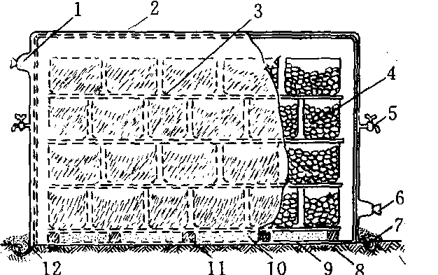 塑料大帐气调贮藏示意图 1.充气袖口 2.顶罩 3.木杆 4.菜筐 5.取样气嘴 6.抽气袖口 7.顶罩与帐底的卷边 8. 地面 9. 帐底 10. 消石灰 11. 垫砖 12.覆土 |