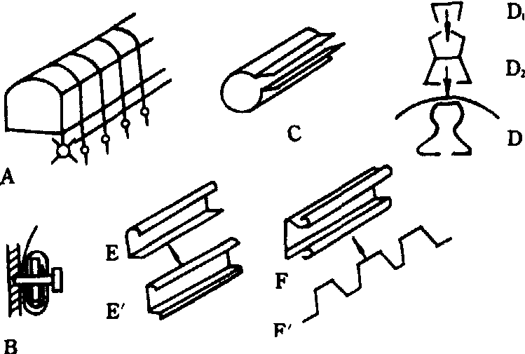 塑料覆盖物的固定 硬质塑料板与骨架固定用自攻螺丝固定,用橡胶条或腻子密封。薄膜的固定方法比较复杂。一般是将薄膜焊接成整块,放在骨架上拉紧拉平,两端固定在墙上或骨架上,脚底用土埋实。顶部和侧边用压膜线或铅丝压紧。压膜线两端系在埋入地下的地锚上。为了放松或拉紧压膜线,在线的一端地锚以上的部分装一个紧线器(图2A)。紧线装置是一根与温室长度相等的细长轴,把每条压膜线系在轴上,转动轴端手轮,使压膜线在轴上卷绕或松开。图2B是木制固定件。竹制温室用铅丝捆绑。钢架结构出现以后使用卡子固定薄膜。图2中C、D、E、F是几种形式的卡子。 二层覆盖装置(见玻璃温室)。