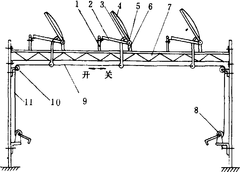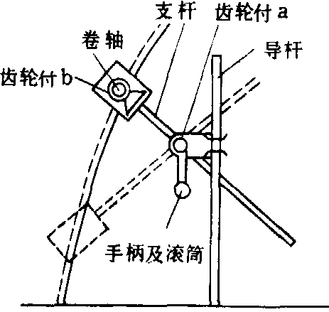 主要结构有活动窗扇、固定窗、顶杆、纵拉杆。活动窗扇上用卡子绷有薄膜,用销轴与固定窗连接,固定窗与温室的拉杆或拱杆连接。启闭原理: 各活动窗扇通过顶杆与纵拉杆连接,当纵拉杆左右移动时,通过连杆机构把活动窗扇顶起。开度可调,关闭严密。启闭完成后用锁定机构锁紧。卷帘式侧窗机构。温室侧面的薄膜最低端固定在一根长的卷轴上,转动卷轴,沿温室长度方向薄膜从下向上卷起。开度根据需要调节。驱动卷轴转动的机构不同,又分为齿轮式卷窗机构,如图5所示。旋转滚筒带动齿轮付a,使支杆在螺纹付中运动,同时带动齿轮付b运动,齿轮付a装置沿导杆移动,卷轴沿拱型骨架光滑地卷起薄膜。相反方向转动滚筒薄膜放下。垂直式侧窗可使用滚轮式卷窗机构(图6),固定薄膜的卷轴一端装有棘轮,棘轮轴端连