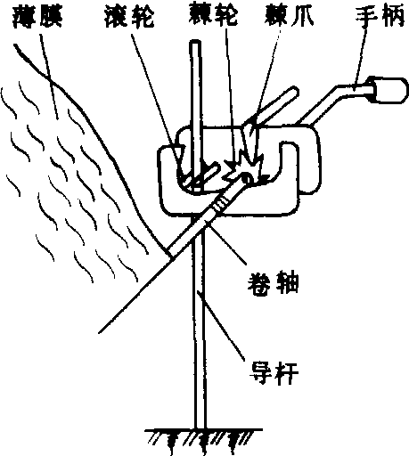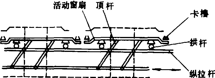 图 2 薄膜固定方法示意图 通风换气机构 通风的方法分自然通风和强制通风。自然通风是利用开天窗和侧窗进行。窗及启闭机构在屋脊型温室中与玻璃温室相同(见玻璃温室)。拱圆型温室中,竹木结构的简易温室用人工扒缝的方法通风。大中型温室内设有机械式或半机械式启闭的天窗、侧窗。窗扇式天窗 有圆形和方形两种(图3、图4)。