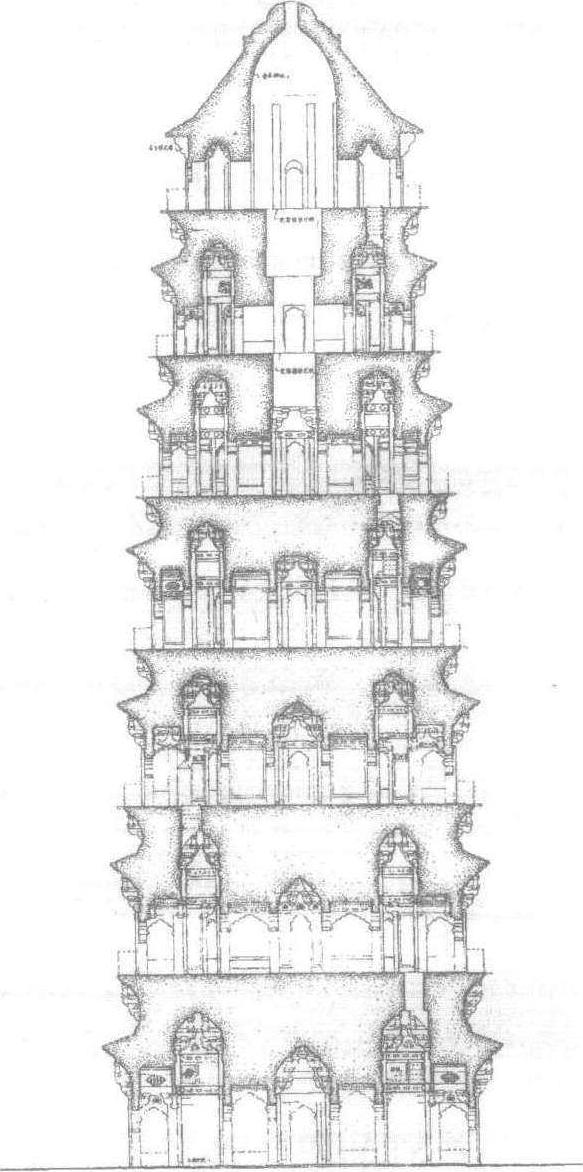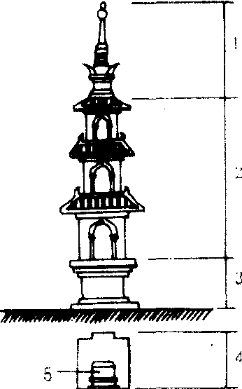 塔的结构示意图 1.塔刹 2.塔身 3. 基座 4. 地宫 5. 宝函 我国古塔现存三千多座,种类繁多,丰富多采。塔的分类方法有多种:如从平面形状上分,有四方形、六角形、八角形、十二角形、圆形等。以建筑材料上分,又有木、砖、石、金、银、铜、铁、琉璃砖瓦造的等等。从佛教教义上讲,又有所谓生身舍利、法身舍利、各种宗教派的塔等等。为了概括和突出古塔在我国古建筑中的艺术造型与结构形式予以分类,大约有楼阁式塔、密檐式塔、亭阁式塔、花塔、覆钵式塔、金刚宝座式塔、过街塔及门塔、宝箧印经塔等。现选择其中比较典型的古塔,分别简述如下: 大雁塔 在陕西西安市城南慈恩寺内。唐高宗永徽三年(652),玄奘为贮藏从印度取回的佛经而建。塔高5层。武则天时重修,增高为10层。后经战乱破坏,只存7层。经明代修葺即今塔。塔身系青砖砌成,高64米,呈方锥体,底层各边长25米,逐层缩小。每层四面各有一券拱门。塔内呈方形,有扶梯盘旋而上,可凭栏远眺。该塔造型简洁,气势雄伟,为典型的楼阁式建筑。塔底的门楣上雕刻唐建筑图案和佛像等线刻画,门旁嵌有“大唐三藏圣教序”碑刻,均是唐代珍贵文物。 祐国寺塔 在河南开封市内。建于宋皇祐元年(1049),为八角十三层仿木构楼阁式砖塔,高54米多。塔身外包砌红、褐、蓝、绿各色琉璃砖,因红、褐色调近似铁色,故称“铁塔”。塔身细部的琉璃上有佛像、菩萨、飞天、狮子、宝相花等装饰花纹50多种。雕工精细,神态生动,为宋代琉璃砖雕艺术的杰作。此塔是我国现存最早最大的一座琉璃建筑。 嵩岳寺塔 在河南登封嵩岳寺内,建于北魏正光元年(520),是我国现存最早的密檐式砖塔。塔高40余米,15层,平面呈十二角形。第一层塔身特别高大,这是密檐塔的特点。塔身之上叠涩出密檐十五层,塔檐之间每面各有小窗1个。15层之上,为一巨大的仰莲瓣组成的须弥座,以承托七重相轮组成的刹身,刹顶为巨形宝珠。整个塔的外形,呈圆和的抛物线状。巍峨挺拔,雄伟壮丽。 崇圣寺三塔 在云南大理城西北原崇圣寺,三塔鼎足而立。大塔方形,中空,名千寻塔,为密檐式建筑,形状与西安小雁塔相似,高69米多,共16层,每层正面中间开券龛,置白色大理石佛像一尊。根据塔的形制和云南当时的政治、经济情况及佛教传入云南的时间分析,此塔建于唐开成(836-840)以后。南北小塔实心,八角形,各十层,均高42米。各层分别雕券龛,佛像、莲花、瑞云等,华丽庄重,两塔顶各有3个衔接的铜制葫芦。第二个葫芦上遮有八角伞,其周边系铜铃,从建筑风格上看,两塔建于五代(907-960)。 妙应寺白塔 在北京西城阜成门内。建于元至元八年(1271),因塔身外部皆抹白灰,俗称白塔。高50多米,塔基为三层方形折角须弥座,其上为半圆突起莲瓣组成的覆莲座和承托塔身的环带形金刚圈,使塔从方形折角基座过渡到圆形塔身,自然而富装饰性。硕大的覆钵形塔身,形如宝瓶,外形粗壮稳健。刹座呈须弥座式,上立着下大上小的刹身,用砖砌成相轮十三重,其上置巨大的铜制宝盖,其周边悬挂着透雕铜制流苏和铜铃。宝盖上是刹顶,为一座铜制小喇嘛塔。1978年维修时,发现塔内藏有乾隆所赐的僧服、经书等各种珍贵文物。据记载,该座塔由尼泊尔工艺家阿尼哥设计建造,是我国喇嘛塔的最早代表作。 真觉寺金刚宝座塔 在北京西直门外,明成化九年(1473)建成。塔和宝座全部用汉白玉石建造,下为高7米多的四方形宝座,座前后辟券门,内有石梯盘旋而上通向宝座顶部。座上分建五座平面方形、单层密檐塔和一座琉璃罩亭。五塔分立在宝座中心和四角。中间一座较高,有十三重檐,四角的四座均是十一层重檐。塔身及金刚宝座上全部雕刻有佛像、梵文及宗教纹饰。造型虽近似印度建筑,但结构和雕刻手法则具有我国传统的民族风格,是中国建筑吸收外来文化的创造性作品。 佛宫寺释迦塔 在山西应县城佛宫寺。建于辽清宁二年(1056),塔高67.31米,楼阁式,塔身外观五层檐,每层出平座,内部则有四个暗层,实为九层,每层均有楼梯盘旋上下。平面呈八角形。平座上绕以柱杆游廊,可供周览眺望。塔的中心为了安置佛像,以各种斜撑和支柱结合使用,增强了塔体的刚度。由于塔的结构庞大复杂,各种物件变化很大,仅斗拱就有六十多种不同尺寸与形式。是我国现存最高、最大的木塔。木塔多次受强烈地震的波及,但没有任何损害。1974年维修时,发现一批辽代写经、刻经和木板套色绢质佛像等珍贵文物,对进一步研究辽代的政治、经济、文化、宗教活动等具有重要意义。 ☚ 佛教传播和寺院经济 云冈石窟 ☛ 塔 塔是供奉和收藏佛舍利(佛骨)、佛像、佛经、僧人遗体的建筑。又称佛塔、宝塔、浮屠、佛图、浮图。中国古塔的形式来源于印度的“悉堵坡”,在印度语中是“坟”或“宗庙”的意思,是释迦牟尼去世后,各地弟子为分藏他的舍利而建的坟的形式。它由圆或方形,多边形的台基、覆钵、宝匣、相轮四部分组成,演变成中国古塔后,台基变高成塔身,下有塔基和地宫,台基以上部分缩小成为塔顶的装饰。相轮上增设宝珠、塔刹等。中国的佛塔有楼阁式塔、密檐塔、单层塔、喇嘛塔、金刚宝座塔、花塔、过街塔等多种形式。楼阁式塔有木塔和砖石结构塔,有屋檐和平台栏杆,楼层各边有门窗可以登临远眺。晚唐前,塔的平面以方形为主,宋辽时期变为八角形,也有六角形的。密檐式塔为砖