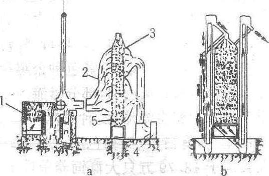 塔式烘干机的工艺流程 a.气流运动路线 b.谷物运动路线 1.加热炉 2.干燥室 3.进排气管道 4.吸风机 5.冷却室 |