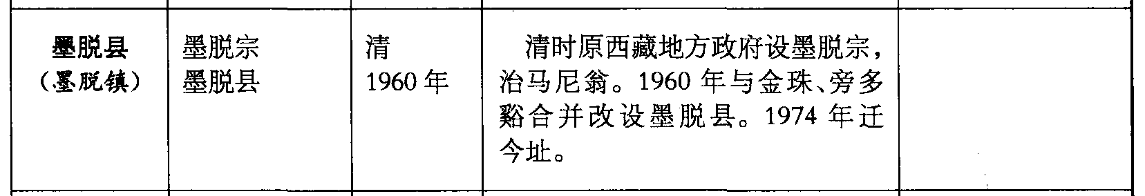 墨脱县(墨脱镇)墨脱宗墨脱县清1960年清时原西藏地方政府设墨脱宗,治马尼翁。1960年与金珠、旁多谿合并改设墨脱县。1974年迁今址。