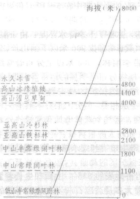 | 释义 | 墨脱自然保护区 129 墨脱自然保护区国家级自然保护区。位于西藏墨脱县境内。区内山高谷深,南部雅鲁藏布江谷地海拔600米,西北部南伽巴瓦峰高达7782米,地势高差极大。形成中国山地植被垂直带谱最完整的地区。从低山热带雨林到高山永久冰雪有多种类型。被誉为植被类型的天然博物馆。有40多种国家重点保护动物,如孟加拉虎、长尾叶猴、羚牛、雪豹等。区内有植物3000多种,有桫椤、海南粗榧、长蕊木兰、云南黄莲等。 ☚ 南滚河自然保护区 佛坪自然保护区 ☛ 墨脱自然保护区 墨脱自然保护区Motuo ziran baohuqu位于西藏自治区东南部的墨脱县境内,面积6万多公顷。保护区西北端耸立着东喜马拉雅的最高峰——南迦巴瓦峰(海拔7 782米)。从西向东奔流的雅鲁藏布江至山峰北麓折向东北,然后环峰作马蹄形回转,流向西南,形成举世闻名的雅鲁藏布江大拐弯,墨脱自然保护区就坐落在这大拐弯的峡谷中,形成这里山高谷深、地势差异极大的地形特征,从海拔不足600米的谷底到西北方南迦巴瓦峰,百余公里的距离内垂直高差达7 000多米。雅鲁藏布江下游谷地是印度洋暖湿气流向青藏高原输送水汽的主要通道,在高大的喜马拉雅山脉阻滞下,本区年降水量高达2 500—5 000毫米。海拔800米以下地区的年均温可达20℃以上,最冷月平均气温不低于13℃,成为青藏高原最温暖潮湿的地区。这里优越的气候条件和独特的地貌形态,形成我国最完整的山地植被垂直带谱(见下图)。海拔1 100米以下的低山半常绿季风雨林带沿河谷向北一直延伸到北纬29°30′附近,是世界上分布最北的热带雨林。往上依次出现常绿阔叶林、半常绿阔叶林、亚高山铁杉林、冷杉林、高山灌丛草甸、高山冰缘植被。最后在雪线以上是永久冰雪带。这依序排列的垂直带谱,组成了北半球湿润地区从南到北各主要植被类型的完整系列,因此有“植被类型的天然博物馆”之称。区内植物种类也极其丰富,国家重点保护植物有被誉为活化石的树蕨桫椤,有海南粗榧、长蕊木兰,还有穗花杉、楠木、马蛋果、千果榄仁等。药用植物种类也很多。优越的生态环境使多种动物都能找到栖身之地,形成本区珍贵、丰富的动物资源。如国家一类保护动物孟加拉虎、长尾叶猴、羚牛、雪豹、熊猴、白尾梢虹雉、灰腹角雉等,二类保护动物有猕猴、小熊猫、金猫、小爪水獭、穿山甲、蟒蛇等。除重点保护的动、植物外,本区还有很多经济价值和科学价值很高的动、植物种。墨脱自然保护区建立于1983年,1986年被批准为国家级自然保护区。