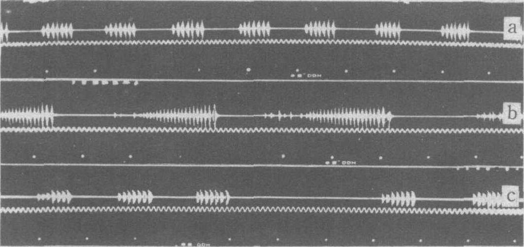 图1 斗蟋不同行为的鸣声节律脉冲序列 a.召唤鸣声信号;b.求偶鸣声信号;c.争斗鸣声信号