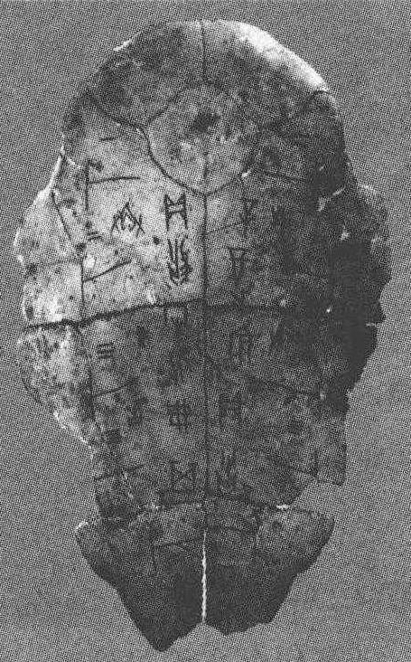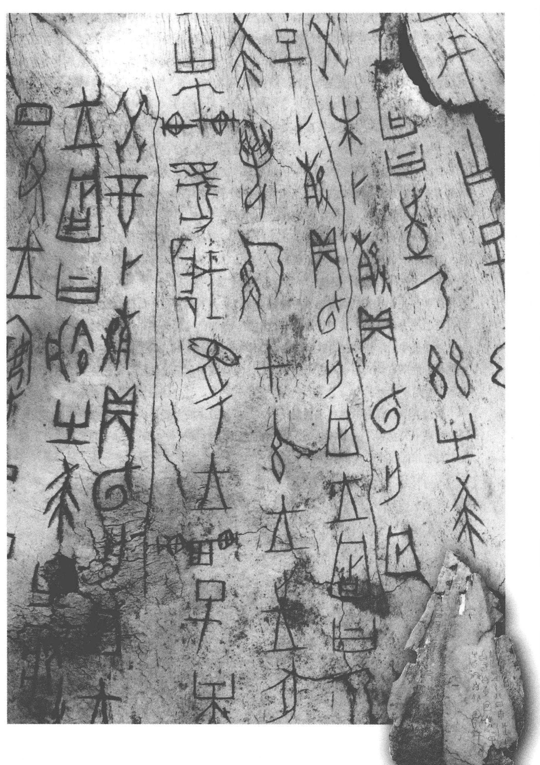 图2—38 甲骨文 自清末在河南安阳殷墟发现有文字之甲骨,已有100多年了,目前出土数量在15万片之上,大多为盘庚迁殷至纣亡这一时期的王室遗物。收录了已出土甲骨片约四分之一片数的《甲骨文合集》 ,总字数约70万字。经整理,出土的甲骨文单字共有4500多个,字形数有6000多个,已经是非常成熟的成系统的文字。它记载了3000多年前中国社会政治、经济、文化等各方面的资料。是现存最早、最珍贵的历史文物。 殷商人祭祀问卜的对象可分为三类: 天神、地祇和人鬼。天神包括 (上)帝、日、东母、西母、云、风、雨等; 地祇包括社、四方、四巫、山川等; 人鬼主要指先王、先公、先妣等。祖先神的崇拜,是祭祀、祈祷的主要对象。 这些祭祀、祈祷活动都通过专司占卜的 “贞人”来实施,他们通过某种神圣的仪式,向天帝、祖先和自然神咨询行事的吉凶祸福,他们是沟通天上和人间的桥梁。这就是历史上已知的最早的掌握文字的群体,这个群体的数量并不大,从延绵300多年的甲骨卜辞中,能够找到的所有贞人也仅只百十来人而已,这就说明,甲骨文完全是一种被少数人掌握和垄断了使用权的文字。 通过占卜而得到的兆相来决定行事,是甲骨占卜的主要目的。占卜者一般都是国王,国王每隔十天左右,就要卜问一次祖先神的意愿。比如甲骨一例 (图2—39) ,骨片上面的文字自右起依次读作[1]: