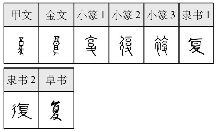 甲骨文(“复”用爲“復”);金文;篆)fù